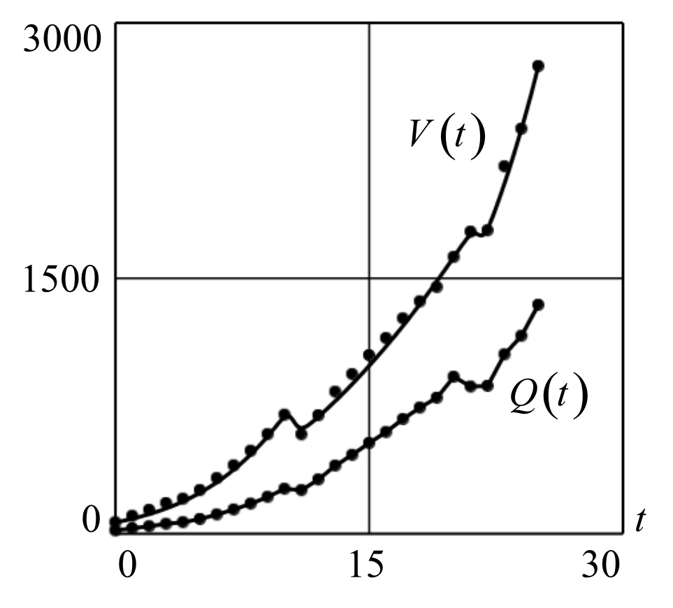 Fig. 3: Theoretical trajectories of the dynamics of development of GRP V(t) and the regional production factor Q(t), constructed using the formulas (18) and (19). The dots correspond to the statistical data in the table.