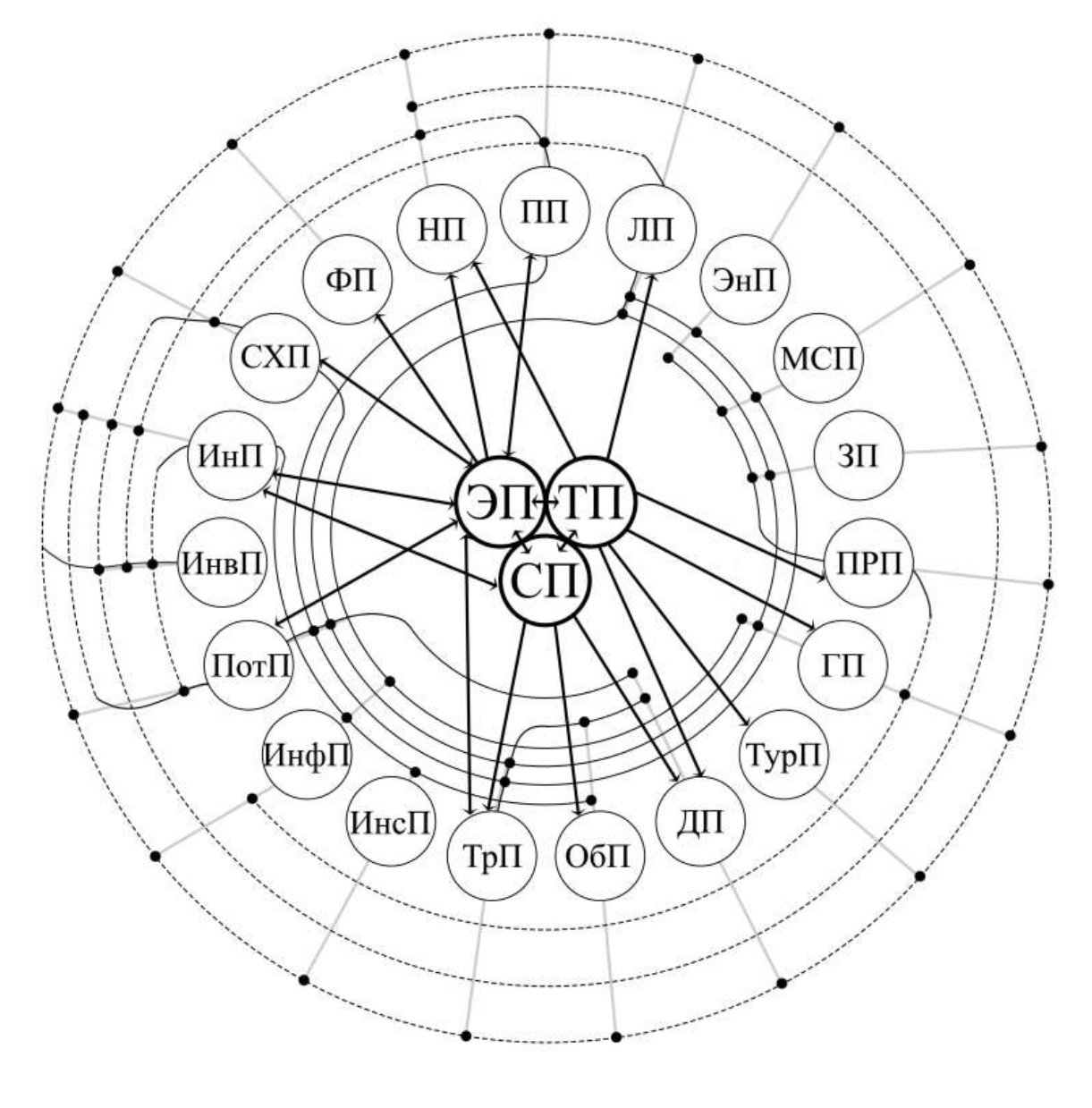 Таким образом на схеме изображено прямое (внутренний круг) и косвенное(внешний круг пунктирной линией) влияние, а также воздействие системообразующих потенциалов (однонаправленные и двунаправленные стрелки).