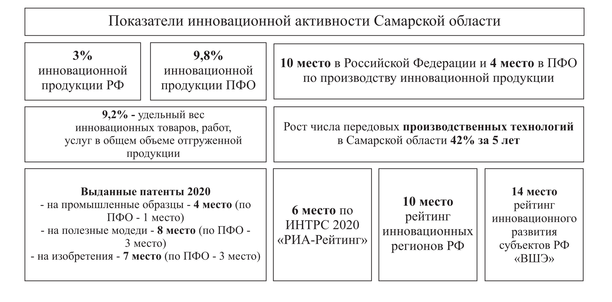 Самарская область одна из лидеров Российской Федерации по инновационной активности, с продвинутой развитой инновационной инфраструктурой. Этот комплекс состоит из Инновационного, Венчурного Фондов области, Центра инновационного развития и кластерных инициатив, Регионального центра инноваций, с помощью которых разрабатываются программы и проекты, продвигаются инициативы и промышленные технологические решения предприятий–инноваторов [6].