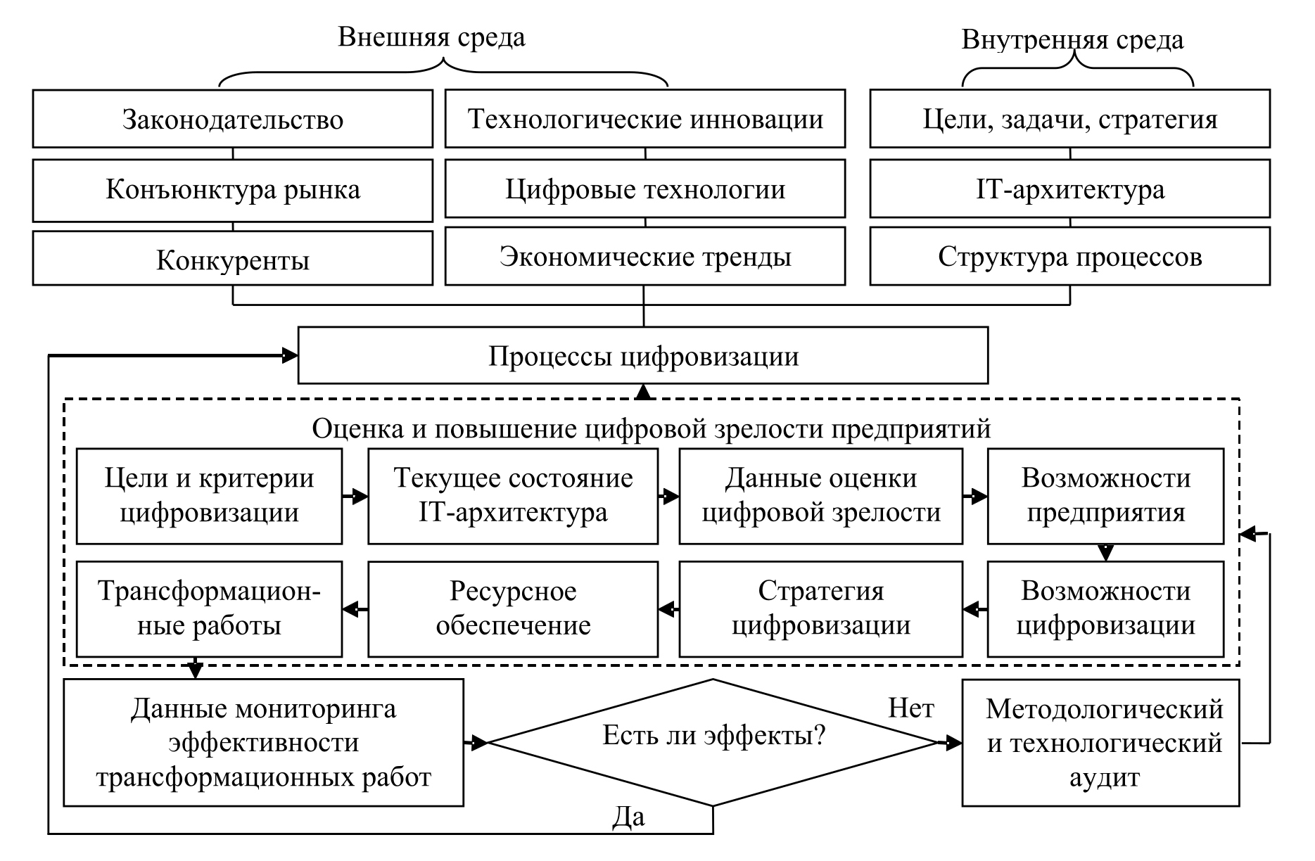 В рамках данного исследования мы формируем типовой механизм оценки и повышения цифровой зрелости предприятий (рис. 1), который способствует осознанию руководством текущего состояния IT-архитектуры, определению проблемных точек в реализации основополагающих процессов и возможностей для их улучшения путем внедрения современных информационных технологий. Его особенностью является то, что он создает опору для выбора методологического инструментария эффективного осуществления исследовательской и трансформационной деятельности, приводящих к росту динамизма и адаптивности предприятий в создавшихся условиях экономического развития.