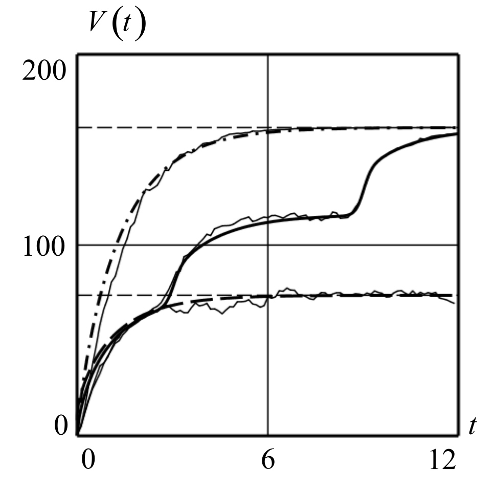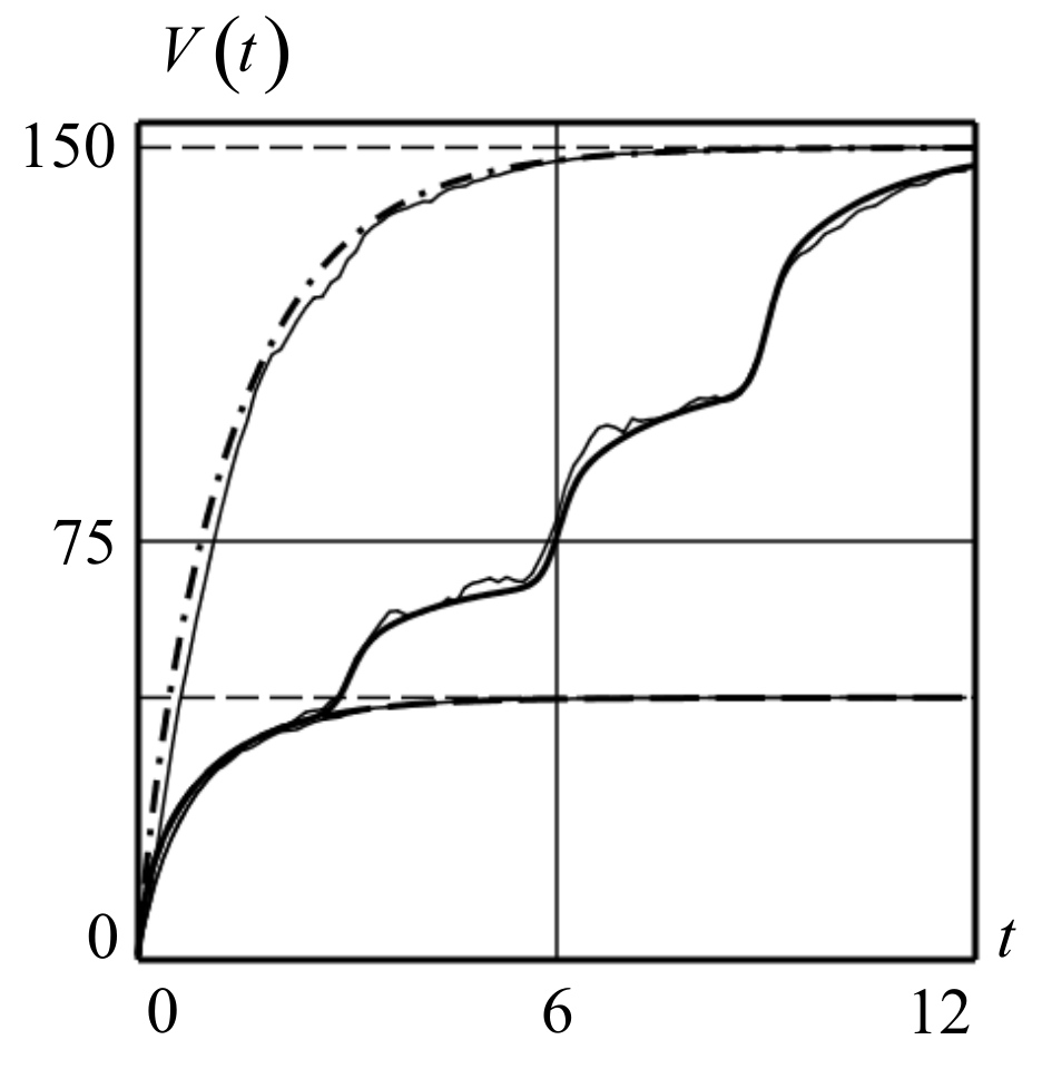 Рис. 5: Варианты стохастических траекторий и кривых математического ожидания роста объемов выпуска продукции V(t), построенных по результатам численных реализаций алгоритма (38) и численных решений задачи Коши (44), (36). Штриховая линия соответствует первому варианту, сплошная линия соответствует второму варианту, штрих – пунктирная линия соответствует третьему варианту.