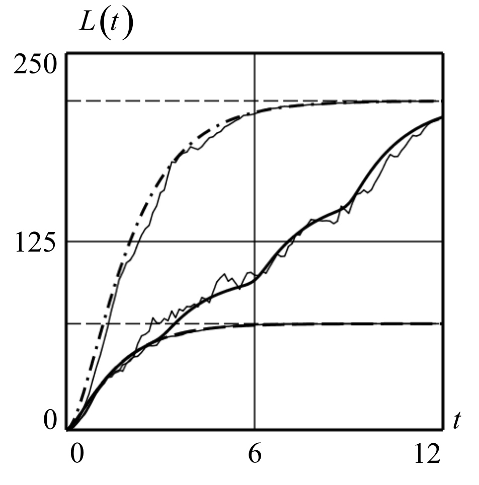 Рис. 4: Варианты стохастических траекторий и кривых математического ожидания роста объемов фактора производства L(t), построенных по результатам численных реализаций алгоритма (38) и численных решений задачи Коши (44), (36). Штриховая линия соответствует первому варианту, сплошная линия соответствует второму варианту, штрих – пунктирная линия соответствует третьему варианту.