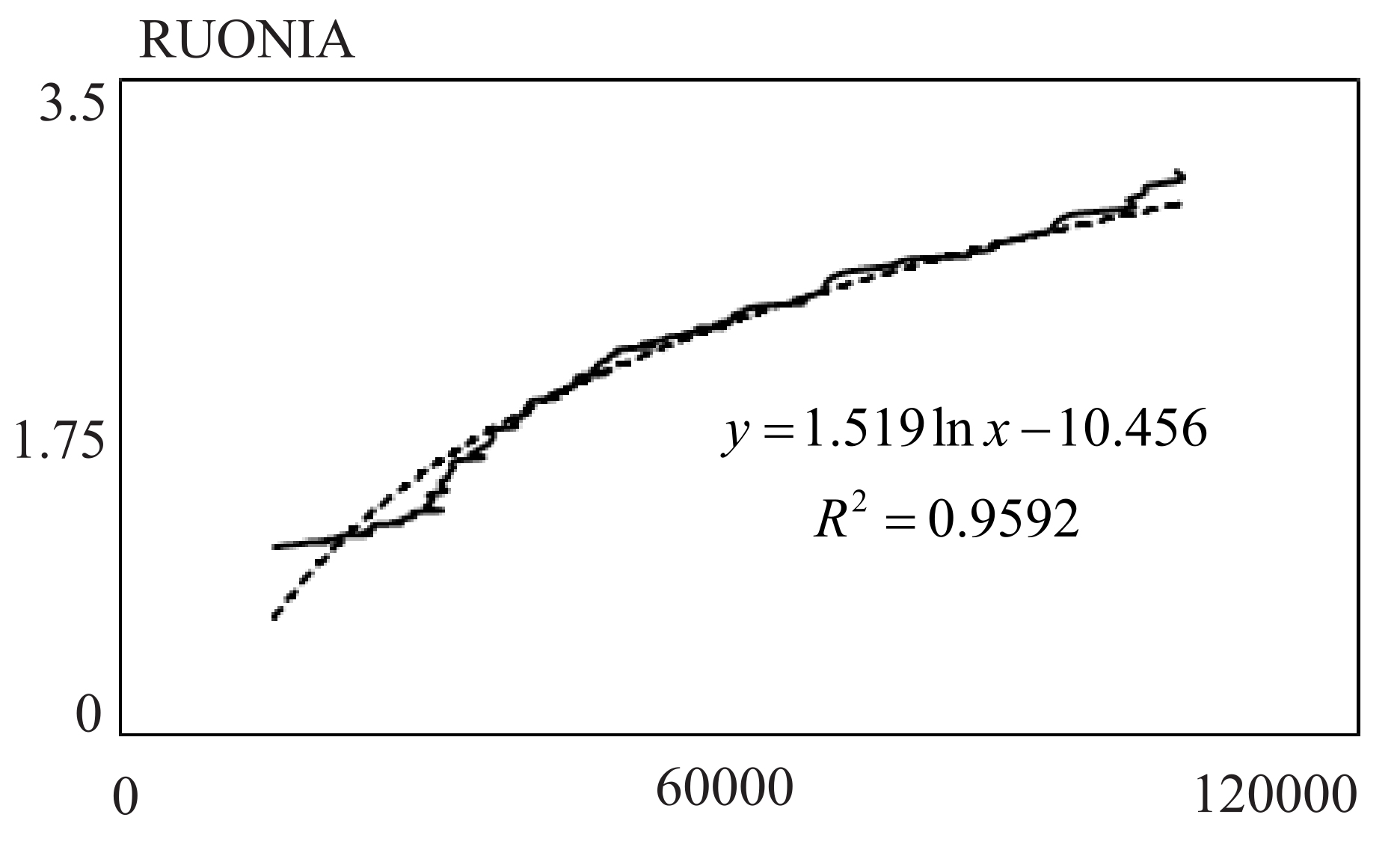 Включение в модель переменной возможно с дополнительным исследованием зависимости . На рис. 2 отражено соотношение денежной массы по оси абсцисс (млн. руб.) и ставки RUONIA по оси ординат (%). Данные представлены за период с января 2010 года по сентябрь 2024 на первое число каждого месяца. Объем исследованных данных по каждому показателю составил более 170 значений, на основании которых была построена функция . Показатель полученной зависимости характеризует высокую степень точности результата моделирования.