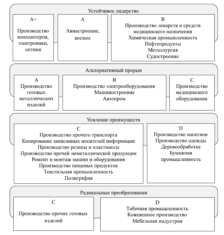 Имплементация авторского методического инструментария в отношении отечественных обрабатывающих производств позволила сгруппировать их по четырем типам стратегического поведения (рис. 1).