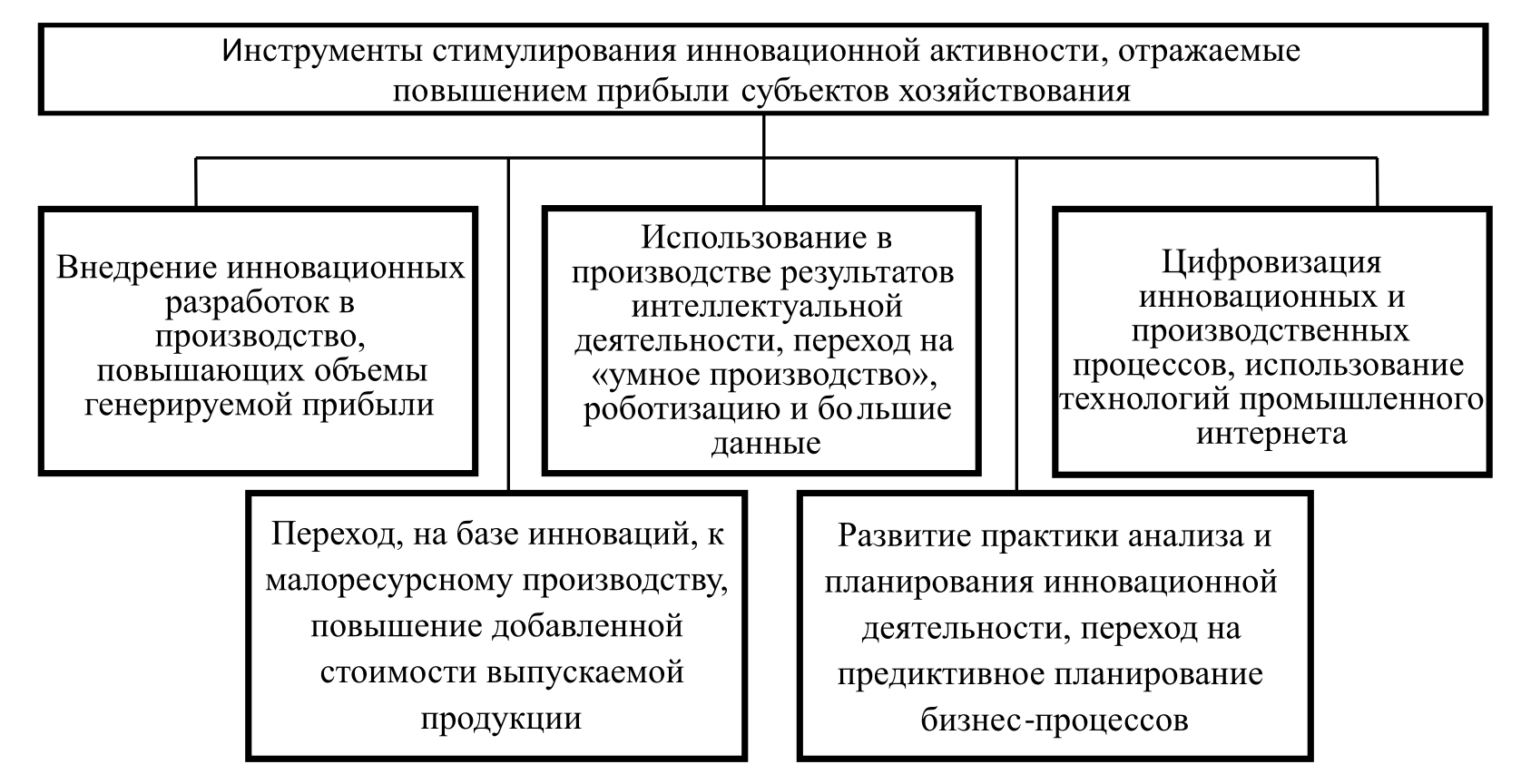 Данные инструменты являются основным критерием определения стимулирующей инновационной политики – они показывают результативность тех или иных мероприятий направленных на развитие инновационной деятельности. Инструменты стимулирования инновационной активности, отражающие повышение прибыли от внедрения инноваций представлены на на рис. 2.