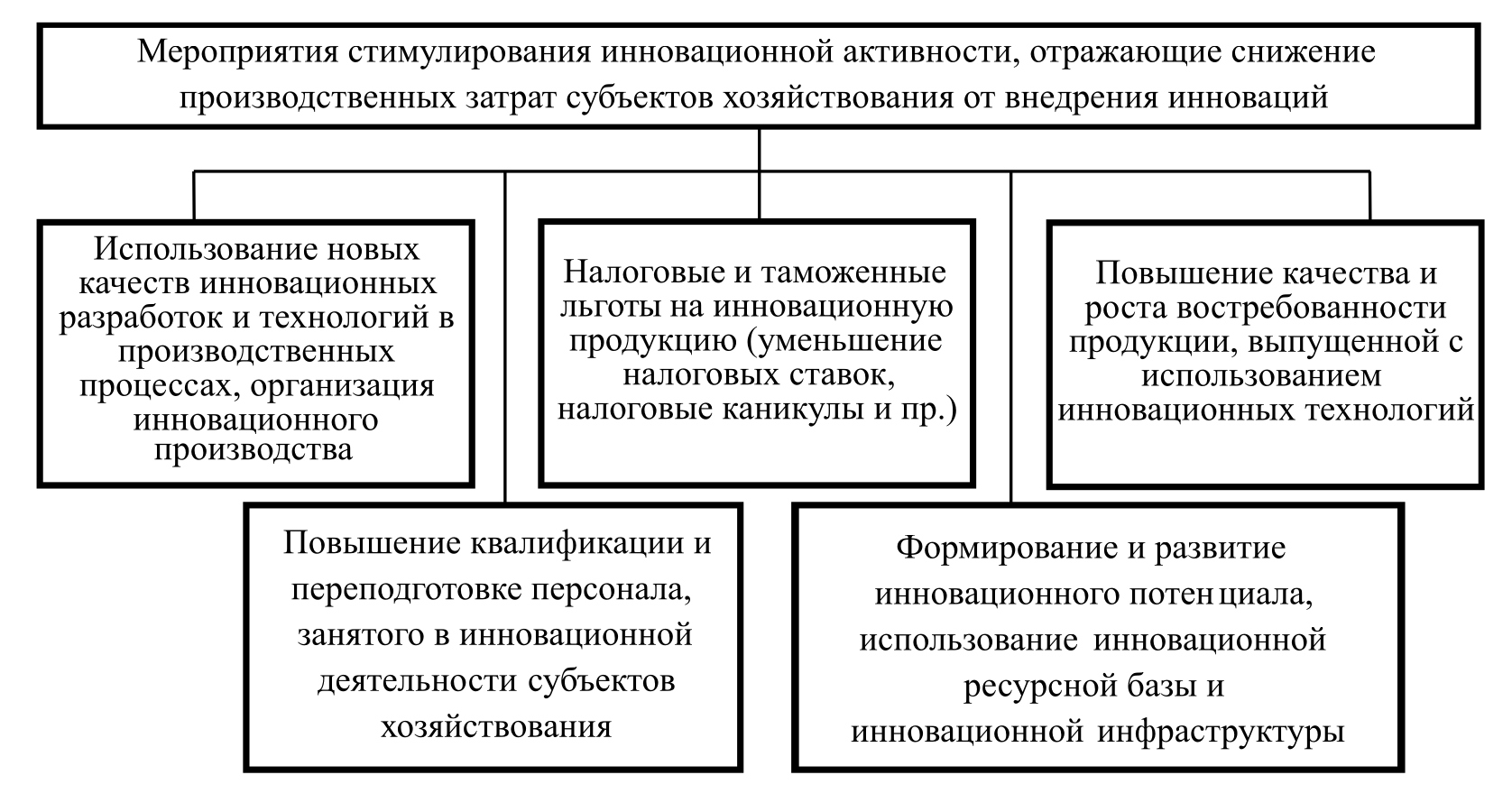 Мероприятия, отражающие снижение производственных затрат от внедрения инновационных разработок в производство, также являются стимулирующими инструментами инновационной активности. Здесь нужно иметь ввиду следующие положения: