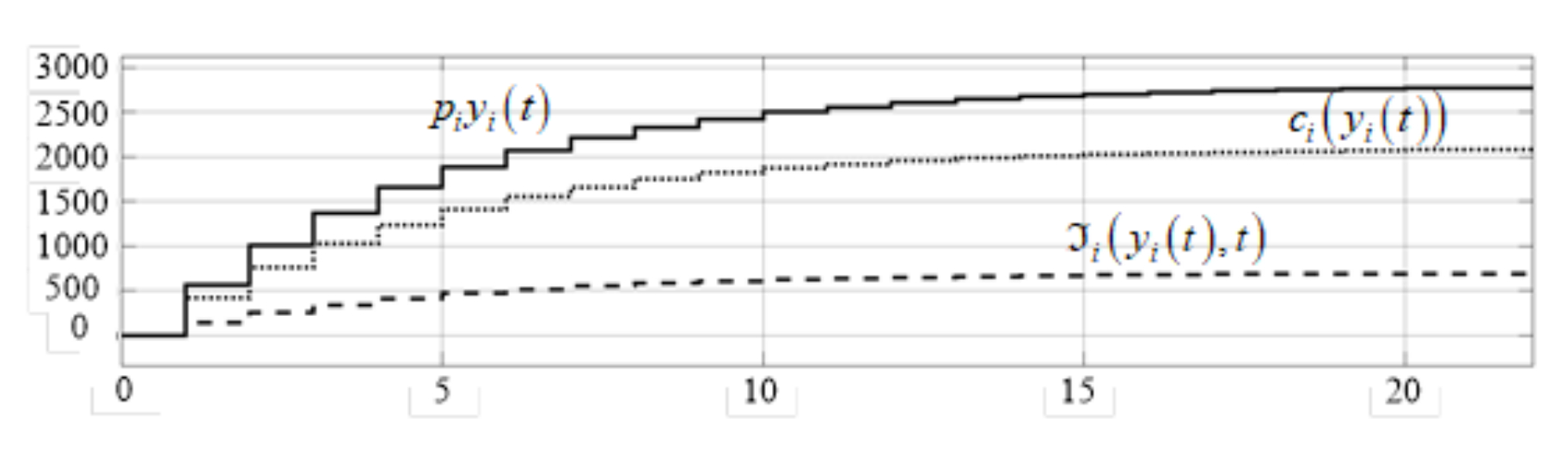 Сформированная аналитическая цифровая модель механизма выбора объемов комплектующих каждым поставщиком (1)–(3) описывает траектории объемов выпуска комплектующих изделий yi(t) и траектории изменения величины прибыли Ji(yi(t),t) в каждый момент времени.