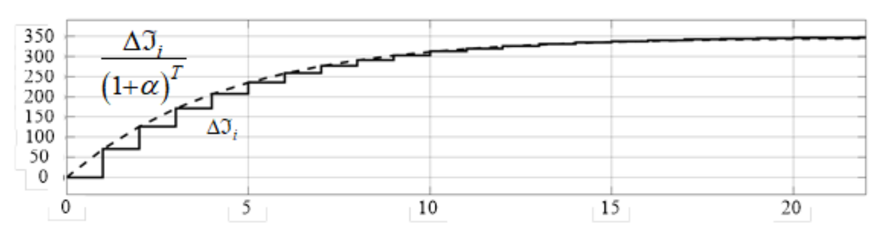 Рис. 7: Траектория суммарного дисконтированного потока эффекта полученного от вложения инвестиций в производственную систему поставщика TΔJi(1+α)T.