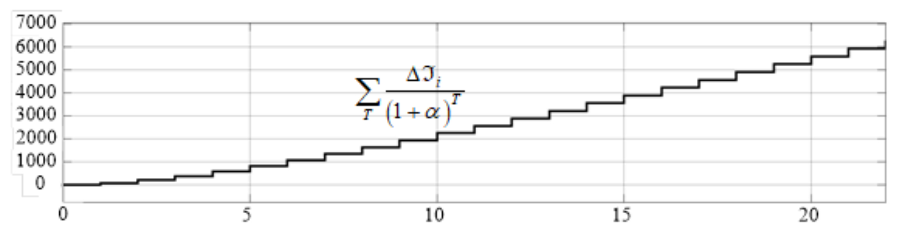На рис. 7. Получена траектория суммарного дисконтированного потока эффекта полученного от вложения инвестиций в производственную систему поставщика TΔJi(1+α)T.