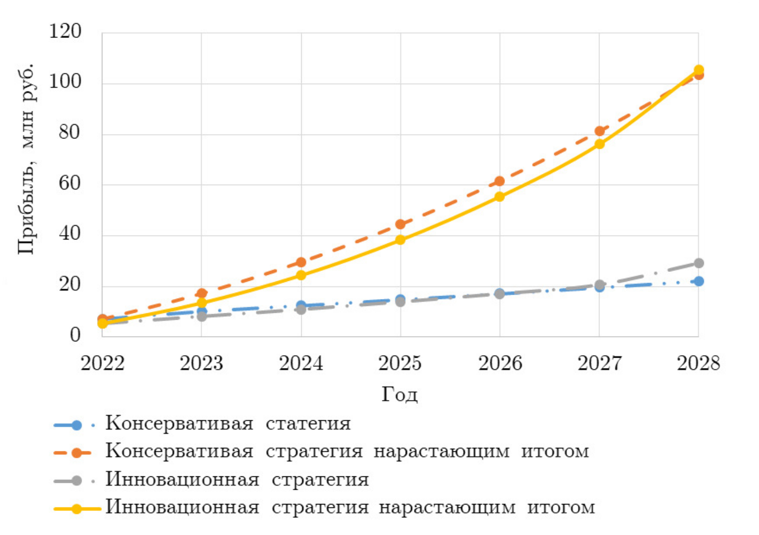 На четвертом этапе были рассчитаны показатели издержек, выручки и прибыли предприятия при реализации предложенных стратегий [15–17], а также проанализирован график прибыли с учетом затрат на ФОТ персонала службы доставки (рисунок 3). Как видно из графика, даже при дополнительных затратах в исследуемый промежуток времени (6 лет) прибыль от инновационной стратегии опережает прибыль при консервативной стратегии, что говорит о том, что данные инвестиции могут быть выгодными.