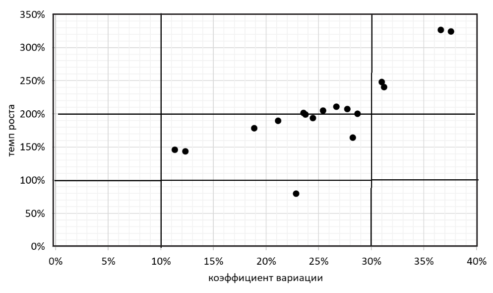 Темп роста за весь исследуемый период позволит определить изменение показателя экономической динамики и в совокупности с анализом коэффициента вариации классифицировать отрасли в соответствии с предложенными терминами (рис. 5).