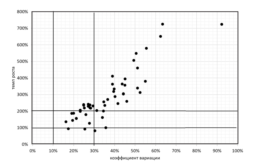 - Предложен метод классификации отраслей экономики на основании значений коэффициента вариации и темпов роста исследуемого показателя отрасли.