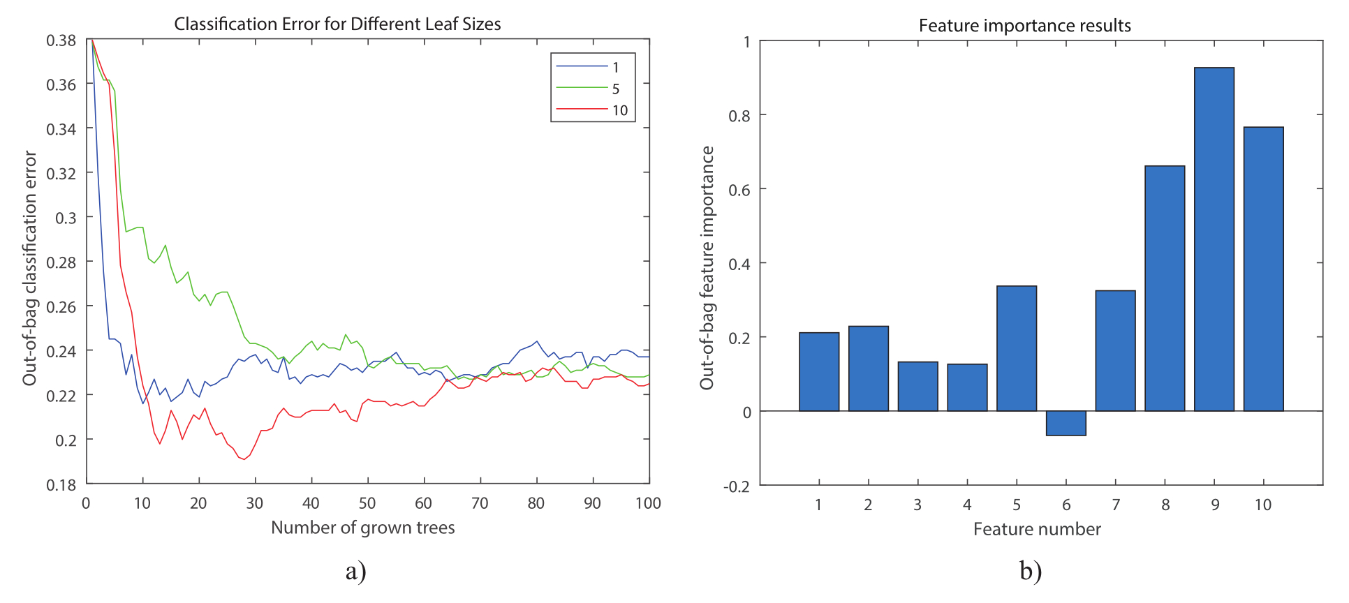 Fig. 3: Training random forests with different leaf widths of decision trees (a); selecting the most important variables (b).
