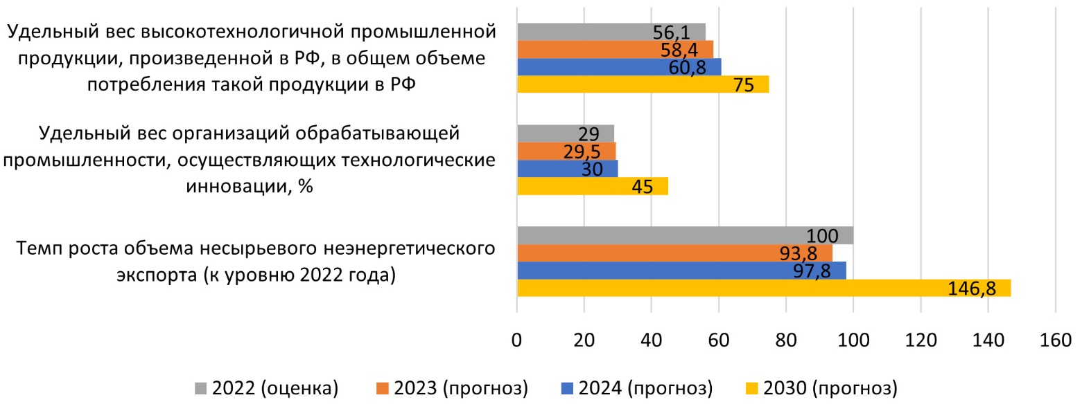Планируется снижение показателя технологической зависимости с 68.7% в 2022 году до 27.3% к 2030 году. При этом, если сравнивать значения данного показателя с крупными мировыми экономиками, то по состоянию на 2021 год в Китае он составлял 23%, а в США — 52%. За счет реализации мер по технологическому развитию доля инновационных товаров, работ, услуг в общем объеме произведенной продукции в России должна увеличиться с 5.2% в 2022 году до 8% в 2030 году. Для сравнения в настоящее время в Германии данный показатель равен 14%, в Италии — 13.5%, а во Франции — 6%. Уровень инновационной активности организаций увеличиться с текущего значения в 11.9% до плановых 27% к 2030 году. Хотя в Германии уже сейчас данный показатель составляет 69%, в Италии — 56%, во Франции — 55%.