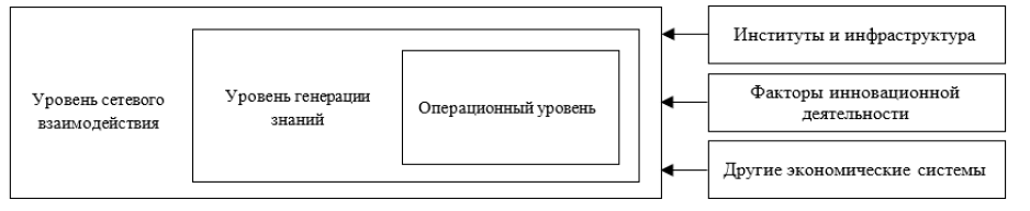 На мезоуровне, в рамках национальной инновационной системы (НИС) оценка процессов создания знаний и внедрения инноваций осуществляется с помощью комплекса индикаторов, позволяющих определить позиции мезосистем в различных рейтингах. При этом учитываются инновационные, образовательные, инвестиционные и инфраструктурные аспекты развития. Основополагающую роль в этой структуре играют сетевые ресурсы, поддерживающие производственно-хозяйственную деятельность.