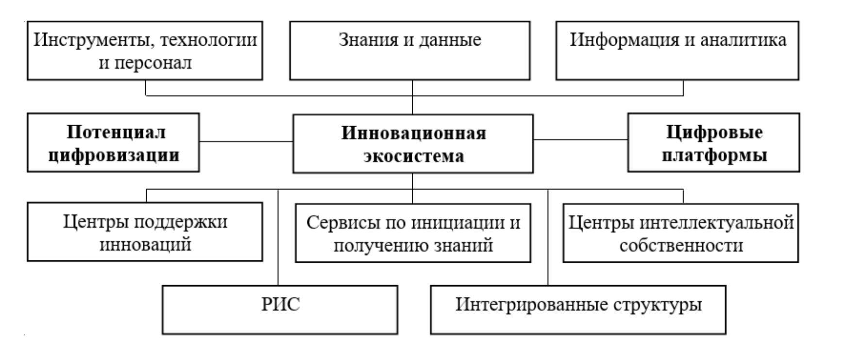 В представленном исследовании, объектом выступает цифровая трансформация инновационной экосистемы промышленного предприятия на базе технологической платформы, предметом — отношения, возникающие при ее осуществлении, а также инструментарий и методическое обеспечение, используемые для обоснования данной модели.