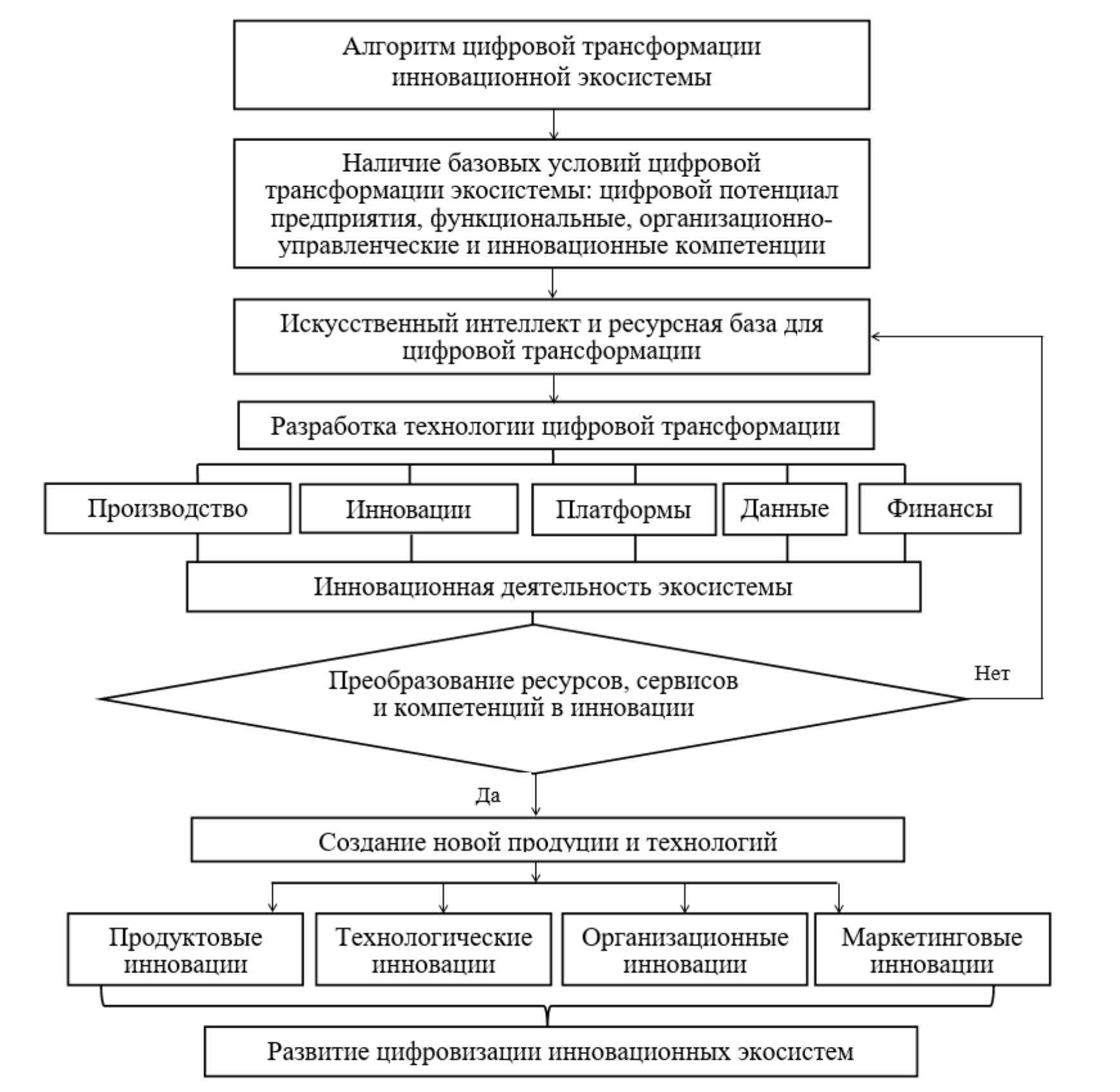 В состав современных интеллектуальных структур экосистемы включаются IT"=пользователи, осуществляющие взаимодействие участников экосистемы по передаче и обмену информацией, с помощью цифровых сервисов общей платформы. Кроме этого, интеллектуальная составляющая цифровой экосистемы включает в себя: интегрированную сетевую и облачную инфраструктуру; сервисы информатизации, программное обеспечение и специализированные приложения аналитики, искусственного интеллекта и машинного обучения [10]. На рисунке 2 отражен алгоритм создания и функционирования модели цифровой трансформации инновационной экосистемы.
