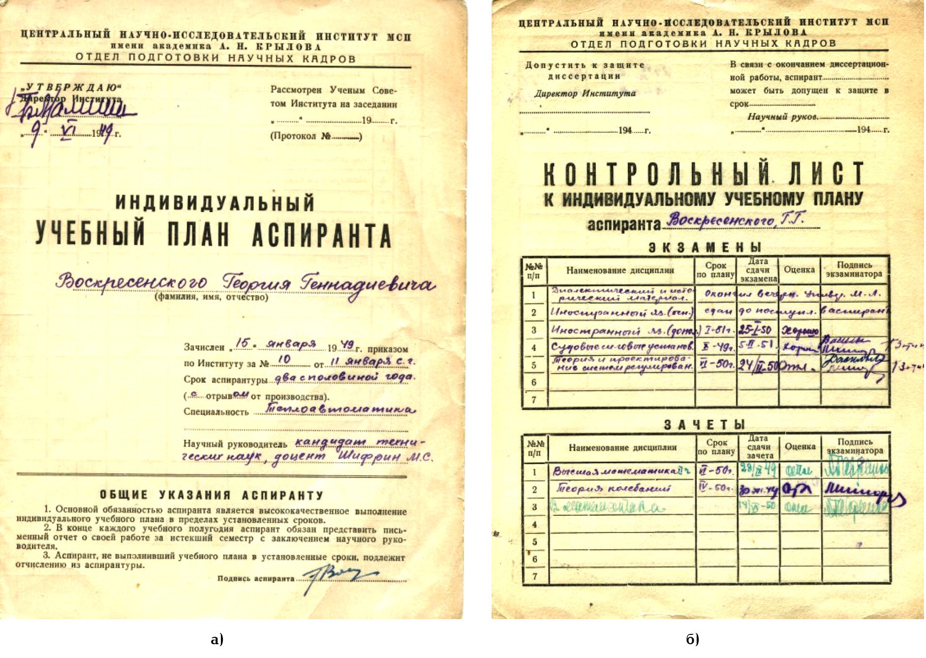 В Великую Отечественную войну Георгий Геннадиевич проработал долгое время в Казани в конструкторском бюро ЦКБ-17, где в то время проектировали торпедные катера. После войны Георгий Воскресенский работал в Центральном научно-исследовательском институте (ЦНИИ) имени академика А. Н. Крылова4 — передовом институте, обеспечивающем новые разработки в судостроении. Крыловский центр имеет долгую и славную историю с 1894 г., когда в Санкт-Петербурге был открыт Опытовый бассейн Морского ведомства — первое в Российской империи научное учреждение для проведения испытаний моделей кораблей. В 1932 г. был создан Научно-исследовательский институт военного кораблестроения (НИИВК). В конце 1930-х гг. в его состав включили большую часть НИИ судостроения и судовых стандартов, и он был переименован в ЦНИИ-45. В 1944 г. ему присвоили имя знаменитого ученого-кораблестроителя А. Н. Крылова, с 1900 по 1907 гг. заведовавшего Опытовым бассейном. В январе 1949 г. Георгий Воскресенский поступил в аспирантуру ЦНИИ им. академика А. Н. Крылова, где в 1953 г. им успешно была защищена диссертация [15] (рис. 2а, 2б).