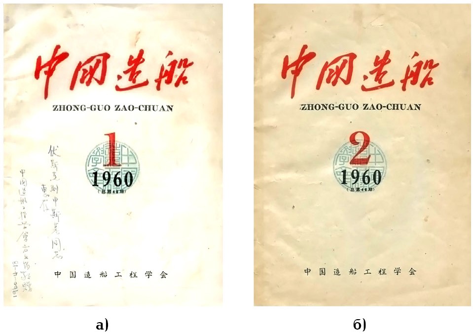 Беспрецедентной по масштабу в то время была помощь советских специалистов в освоении научной литературы. За несколько первых лет сотрудничества было переведено на китайский язык и издано свыше трех тысяч наименований книг по различным специальностям, в т.ч. судостроению [17]. Так, в период командировки в КНР также вышли статьи с уникальными научными разработками Георгия Геннадиевича в журнале «Китайское судостроение» на русском и китайском языках [18] (рис. 5а, 5б).