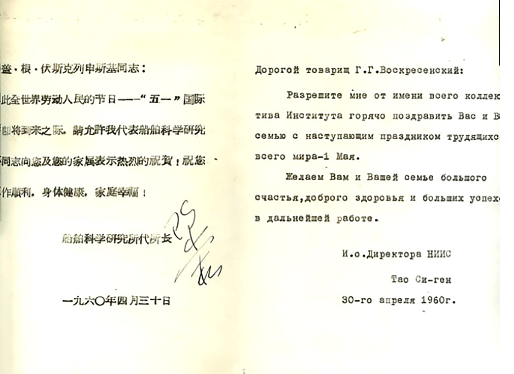 Рис. 8. Поздравительная открытка подписана 30 апреля 1960 г. и.о. директора Института кораблестроения Тао Си-геном