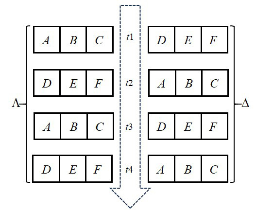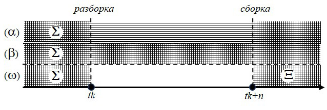 Рис. 6. a-стратегия, b-стратегия и w-стратегия о существовании и выживании мереологических композитов в процессе их разборки и сборки (вертикальными линиями закрашены периоды времени, в которые объект существует; горизонтальными линиями — в которые объект выживает