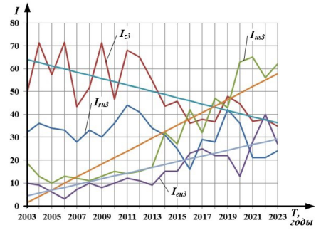 где Т — годы рассматриваемого периода 2003– 2023 гг.