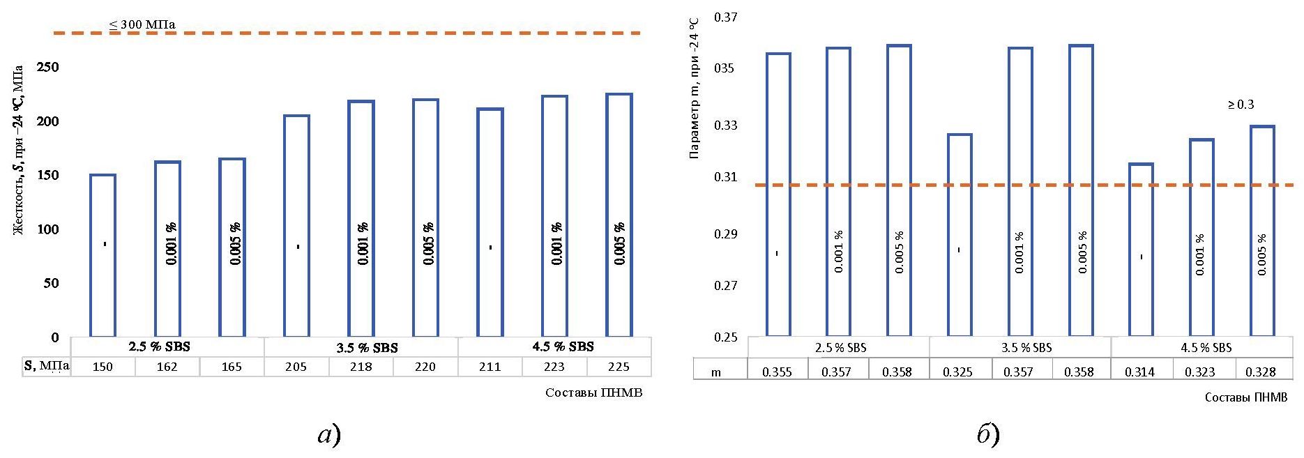 Из анализа рисунка 4а видно, что жесткость S незначительно увеличились для всех наномодифицированных вяжущих. В среднем увеличение составило не более 7 %. Это позволяет заключить, что одностенные углеродные нанотрубки в исследуемом диапазоне не ухудшают низкотемпературных характеристик вяжущего.