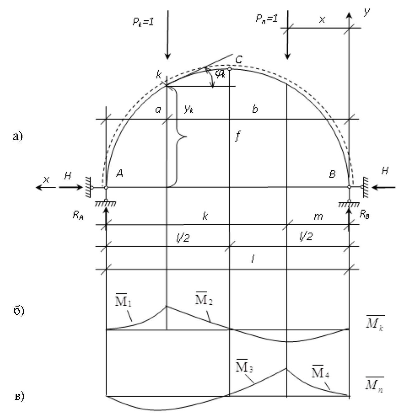 Рис. 2. Исходная расчетная схема трехшарнирной арки для определения усилий при (а); эпюра моментов от действия единичной силы Рk = 1, приложенной в сечении k (б); эпюра моментов от действия единичной силы Рn = 1, приложенной в произвольном сечении n (в)