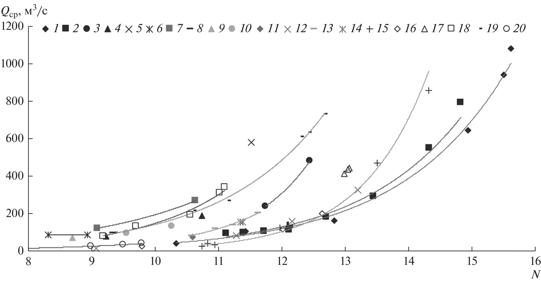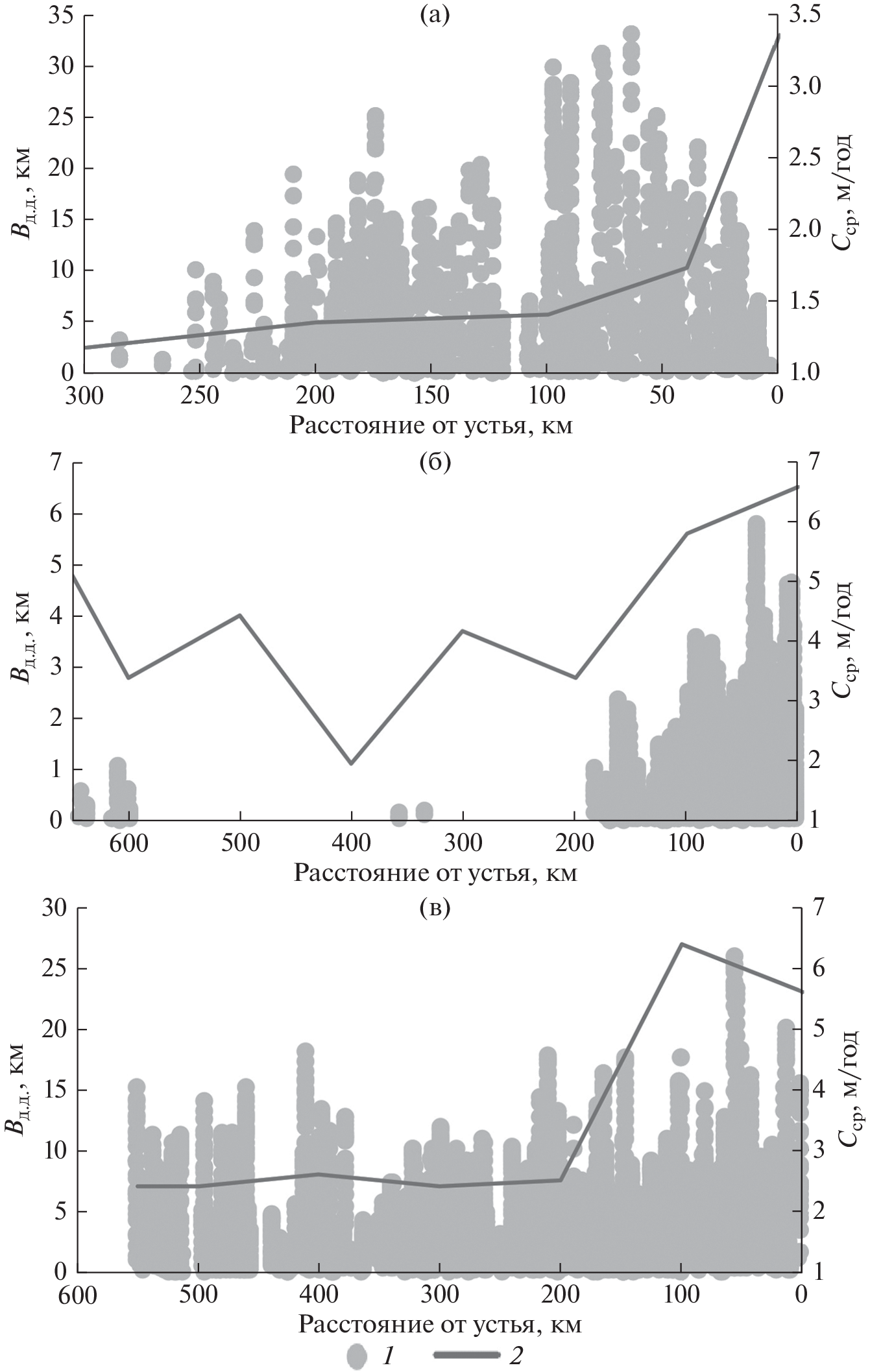 The article analyzes the patterns of riverbanks erosion of medium and large rivers of the Ob−Irtysh rivers’ basin. They have a real and potential threat. The territory in different parts differs in the regime of water and sediment runoff under free and relatively homogeneous free conditions of channel formation (wide floodplains composed of sandy deposits). The increase in the order of rivers, which is an indirect indicator of their water content, leads to the activation and increase in the intensity of horizontal channel deformations. The geological and geomorphological conditions of channel formation (the width of the valley bottom and the influence of bedrock banks), along with hydroclimatic factors, affect the rate of channel displacement and their re-formation. According to the conditions of river bank erosion, seven regions are distinguished in the Ob−Irtysh basin, each of which is characterized by different intensities of channel deformations and hydrological and morphological dependences that connect their indicators (rate and length of riverbanks erosion fronts) with the channel and water content of the flow. The characteristics of bank erosion (rate and the length of the erosion front) depend on the shape of the channels, which determines the hydraulic characteristics of the flow. Riverbanks erosion rates increase with an increase in the degree of development of the meanders. The water content of the river and decreases in the branches due to the dispersal of the runoff. The washout front, ceteris paribus, is longer for flat bends. The bedrock banks recede mainly due to the development of landslides and scree, provoked by the impact of the flow on them.