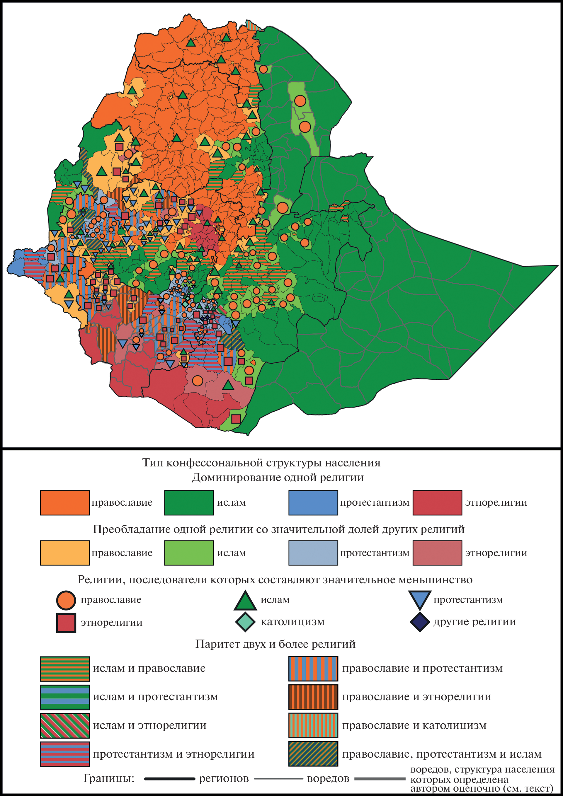 В статье определены закономерности развития конфессионального пространства Эфиопии в период существенного расширения религиозных свобод после 1991 г. В качестве статистической базы исследования использованы данные переписей населения страны за 1994 и 2007 гг., содержащие информацию о религиозной принадлежности населения Эфиопии в целом и ее административно-территориальных единиц вплоть до воредов – АТЕ 3-го порядка. Направления сдвигов в размещении последователей крупнейших религий страны (православия, ислама, протестантизма, этнорелигий) определены на основе типов конфессиональной структуры населения, с помощью которых были отражены особенности конфессионального пространства Эфиопии с высоким уровнем детализации. Выявленные тенденции развития конфессионального пространства страны отражены в картосхемах, иллюстрирующих динамику типов конфессиональной структуры населения воредов. На основе картографической информации выявлены закономерности реконфигурации геопространств крупнейших религий страны, спровоцировавшей усиление процессов поляризации в конфессиональном пространстве государства. Определено, что конфессиональная структура населения регионов доминирования православия, ислама и протестантизма стала более гомогенной, при этом главным направлением развития геопространств этих религий стало их расширение по направлению к столичному региону. В результате сформировались особые пространственные структуры – своеобразные фронтиры на границах геопространств этих религий. Интенсификация религиозной конкуренции в Эфиопии, которая до недавнего времени считалась “эталоном” гармоничных межобщинных отношений в Африке, сопровождалась ростом конфликтности. Установлено, что важную роль в этом процессе сыграло изменение конфессиональной структуры городского населения, в которой произошло резкое увеличение протестантов и мусульман. Вовлечение религиозных организаций в общественно-политические процессы, происходившее в стране на фоне обострения религиозной конкуренции и межэтнического соперничества, способствовало усилению центробежных тенденций в политической жизни Эфиопии. Одним из результатов данных тенденций стало разукрупнение ряда административно-территориальных единиц в юго-западной и центральной частях страны.