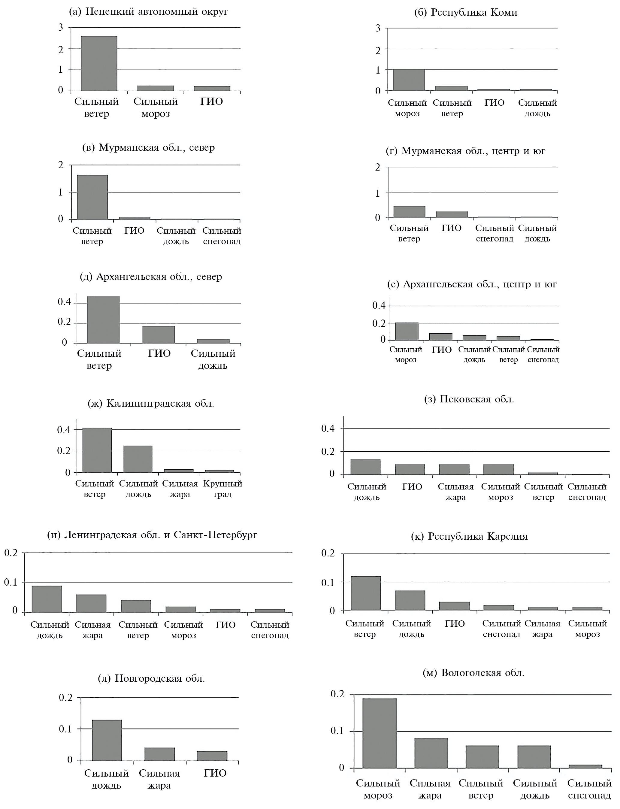 По особенностям воздействия на наземные экосистемы ОЯ были сгруппированы в следующие группы: сильный ветер, сильный дождь, сильный снегопад, крупный град, сильные гололедно-изморозевые отложения (ГИО), сильная жара, сильный мороз. На рис. 1 представлено среднее годовое число дней с ОЯ в различных областях Северо-Западного региона России. Наиболее неоднородные в климатическом отношении территориальные единицы – Мурманская и Архангельская области – были разделены на северную и южную части в соответствии с границами климатических и природных зон, определенными по классификации Б.П. Алисова.