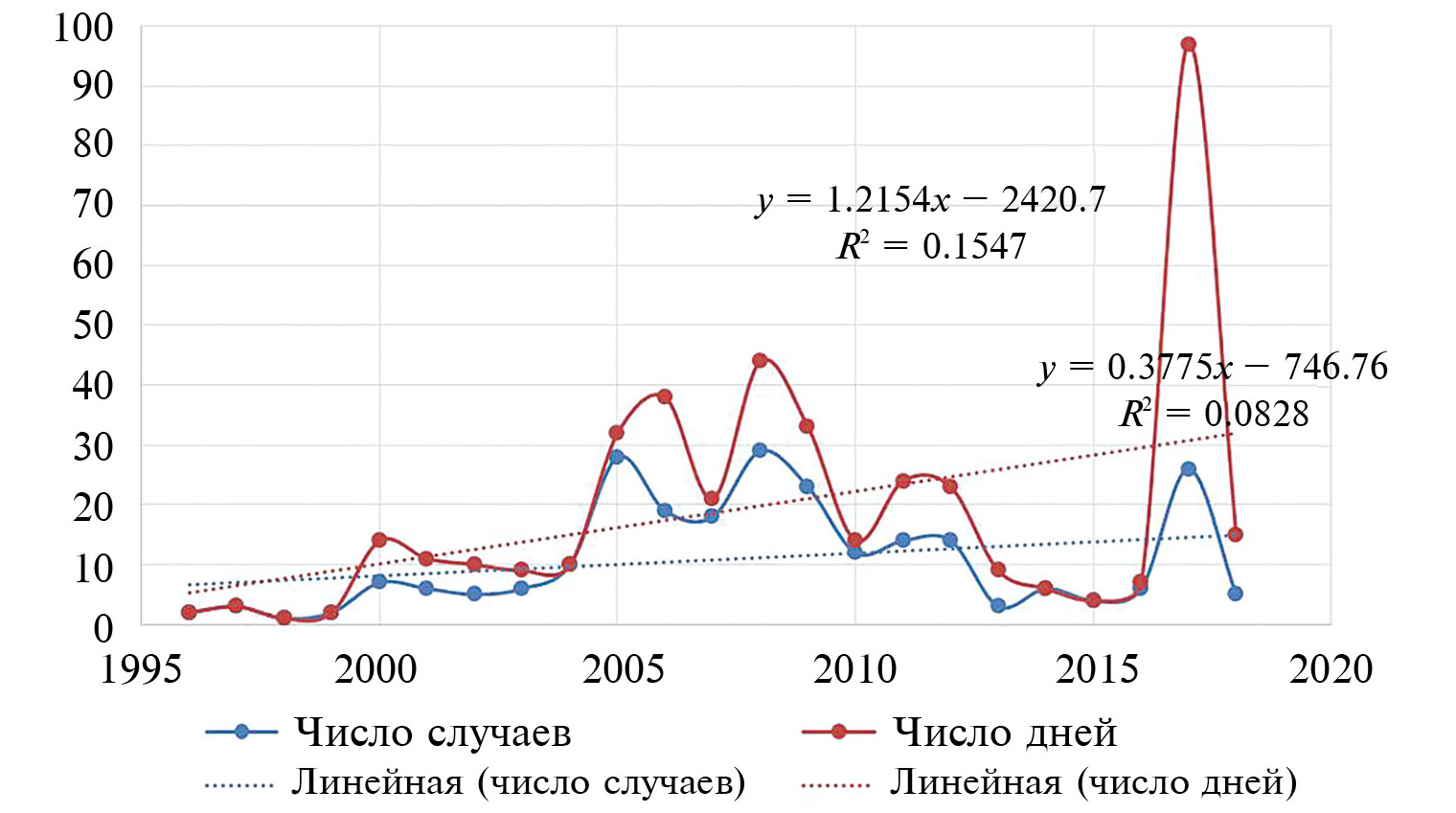 Рис. 3. Многолетние изменения числа случаев и числа дней с опасными гидрометеорологическими явлениями на территории Архангельской области в 1996–2017 гг.
