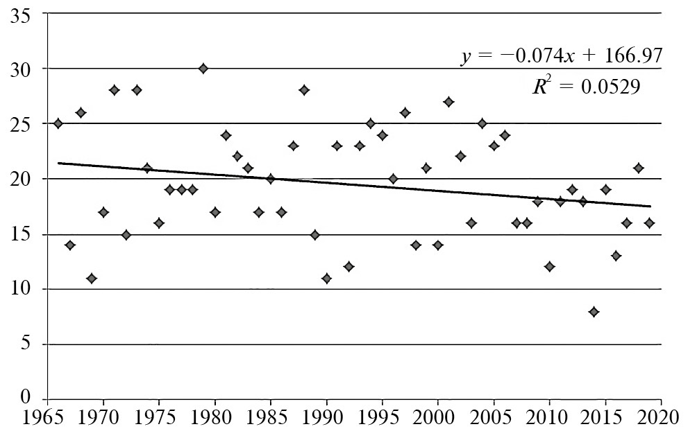 Рис. 5. Многолетние изменения суммарного за год числа дней с переходом температуры воздуха через 0ºС в 1966–2019 гг. в Калининграде.