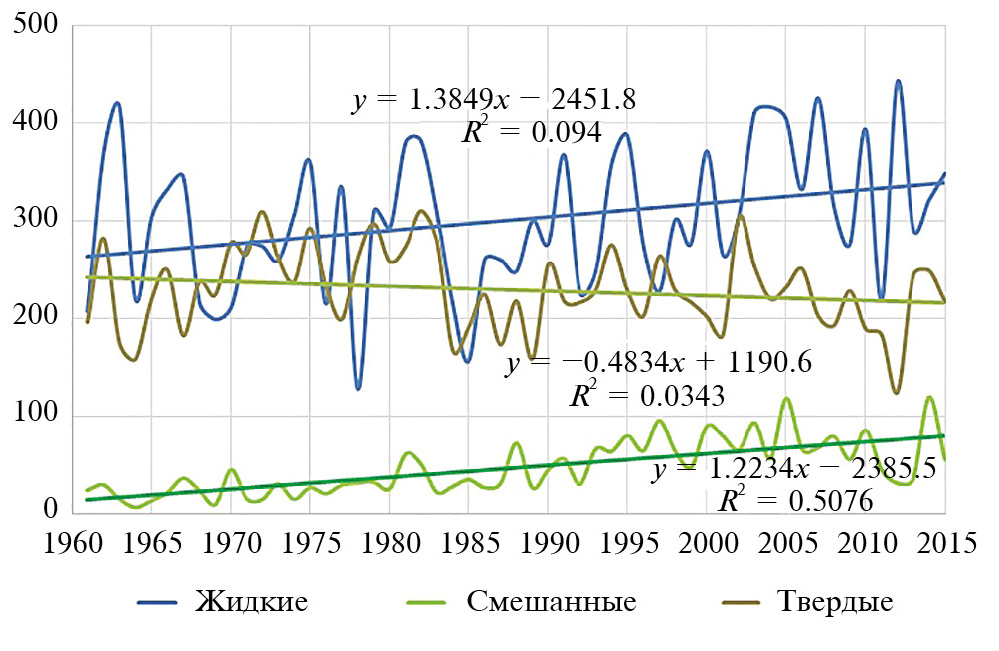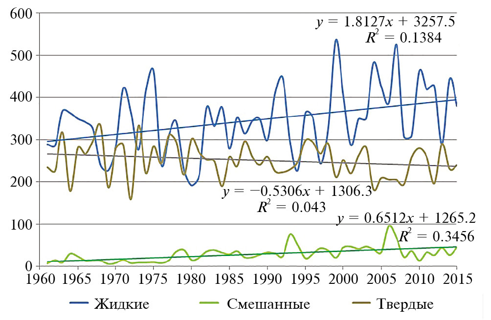 Рис. 6. Многолетние изменения сумм осадков различных видов в 1961–2015 гг. в Мурманске, мм.