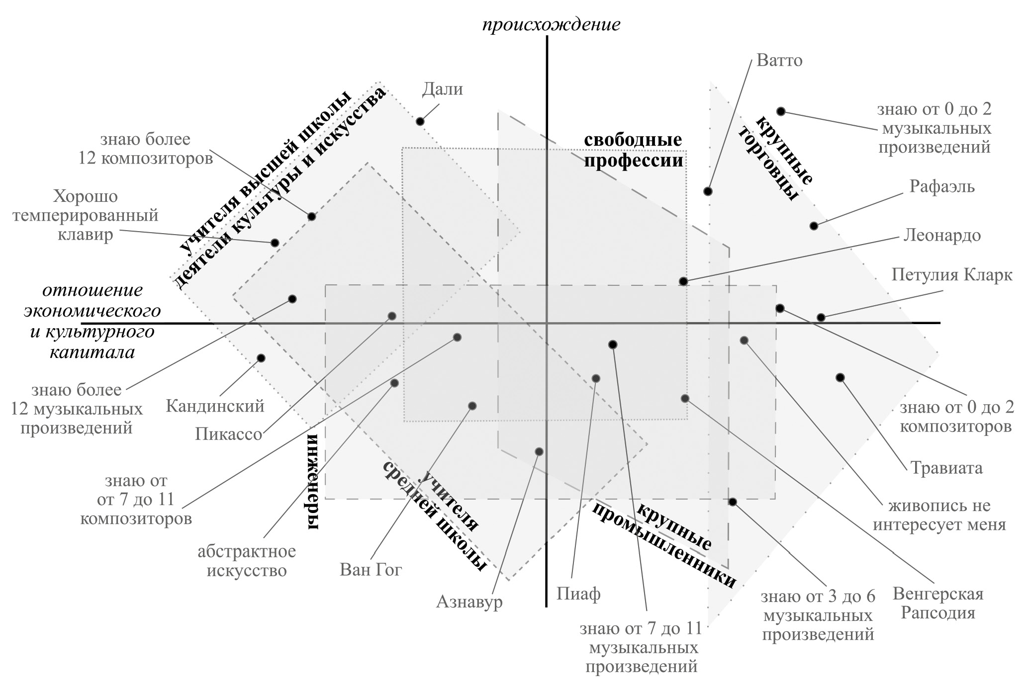 Многоугольниками ограничены области, где расположены респонденты из какой-нибудь профессиональной группы. Отдельными жирными точками показаны средние координаты респондентов, давших определенный ответ на некоторый вопрос. Например, координаты точки “Пиаф” рассчитаны как средние значения координат респондентов, считающих Э. Пиаф любимым музыкантом. П. Бурдье наложил два пространства друг на друга: пространство профессий и пространство произведений культуры и затем наблюдал за их пересечением.