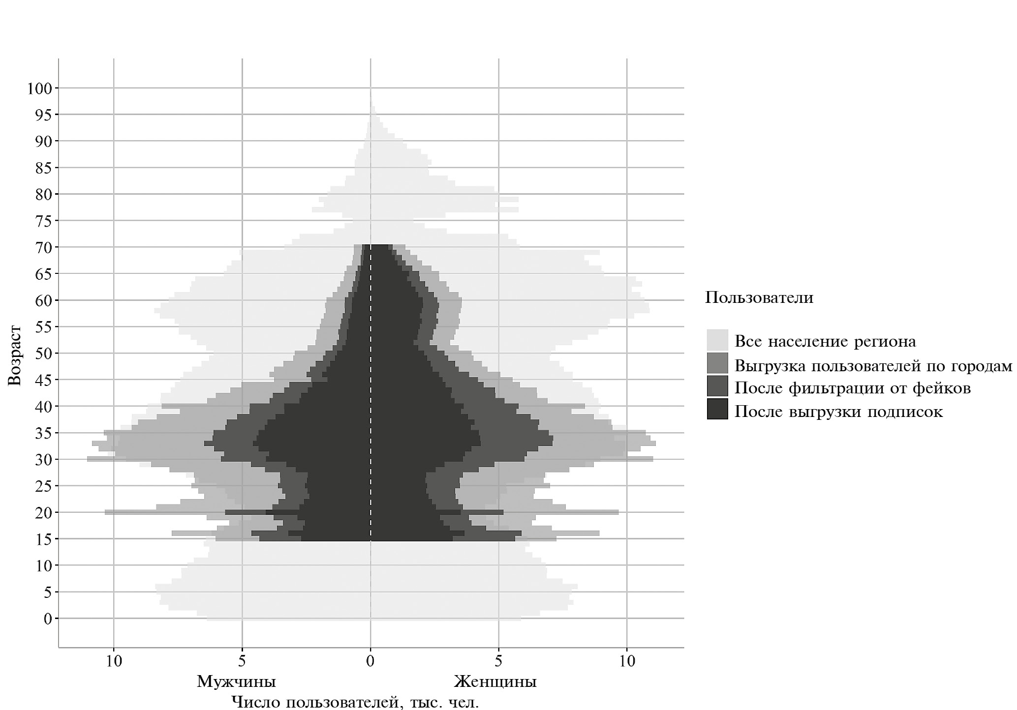 Рис. 4. Трансформация половозрастной пирамиды пользователей выгрузки “ВКонтакте” при загрузке и фильтрации данных.