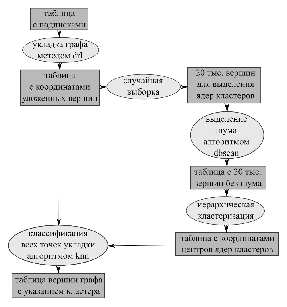Выделить кластеры на укладке графа напрямую не получится. Во-первых, плотность вершин в разных сгущениях сильно различается, а алгоритмы плотностной кластеризации, например dbscan, не могут корректно выделять кластеры с разной плотностью точек. Во-вторых, данные сильно зашумлены (шум – точки, которые не попадают в сгущения вершин на укладке графа), а иерархическая кластеризация и k-means плохо работают на зашумленных данных (k-means в данном случае вообще не подходит – мы не знаем точно число кластеров). В-третьих, для иерархической кластеризации нельзя брать все точки на укладке (почти 400 тыс. шт.) – матрица расстояний не поместится в оперативную память персонального компьютера. В итоге, берется случайная выборка из 20 тыс. точек; используя dbscan, убирается шум (его плотность невелика и везде одинакова); затем с помощью иерархической кластеризации выделяются центры кластеров, к которым приписываются оставшиеся точки по принципу ближайшего соседа.