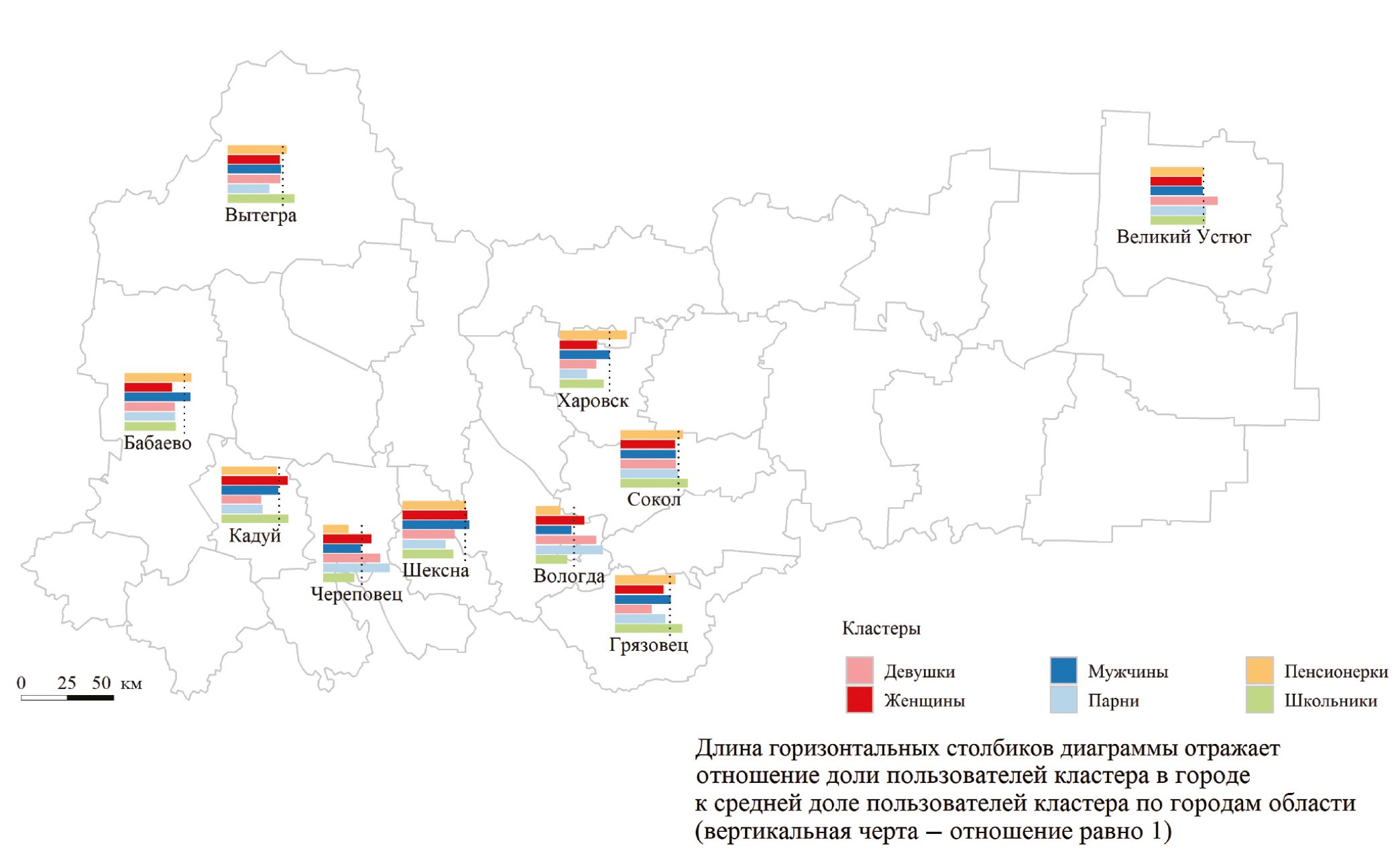 Структура половозрастных кластеров города зависит от его людности (рис. 9). В крупных городах – Череповце и Вологде (население около 300 тыс. чел.) – повышена доля кластеров “Женщины”, “Девушки” и “Парни”, но сильно понижена доля кластеров “Пенсионерки” и “Школьники”. Доля этих двух кластеров велика в малых города с населением 10–20 тыс. жителей. Структура половозрастных кластеров средних городов (Великий Устюг и Сокол) строго соответствует средней по региону. Можно говорить об инверсии структуры половозрастных кластеров населенного пункта при переходе от крупных городов к малым. Возможно, люди в трудоспособном возрасте, из которых состоят кластеры “Женщины”, “Девушки” и “Парни”, уезжают из малых городов в Череповец и Вологду на учебу или на работу, за счет чего их доля в крупных городах больше, чем в малых. Снижение доли пользователей Вологды и Череповца в младших возрастах, вероятно, связано также с тем, что в крупных городах люди этой когорты активно пользуются другими социальными сетями, например “Инстаграммом”. Не понятно, что объясняет повышенную популярность “ВКонтакте” в малых городах у женщин после 50 лет. Мужчины этого возраста там так же безразличны к “ВКонтакте”, как и в больших городах.