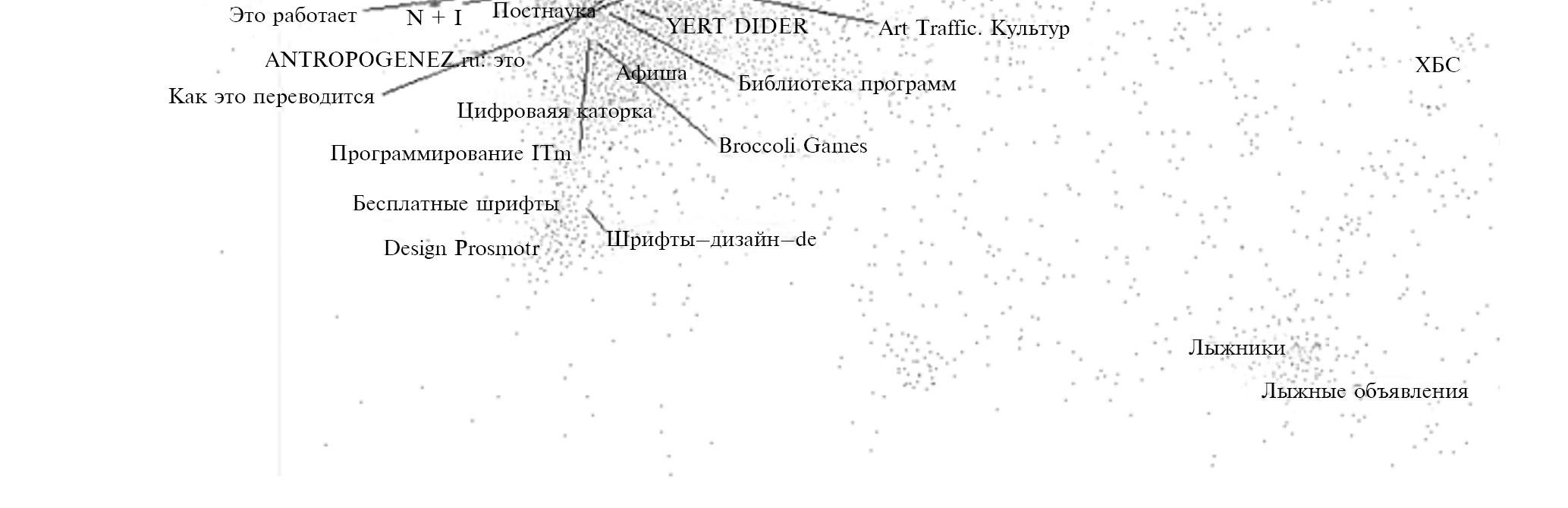Масштабные исследования социальных сетей – довольно трудоемкое дело, этим занимаются большие коллективы. Наиболее существенные результаты по анализу русскоязычных социальных сетей показал гарвардский центр Беркмана. Там выполнили два крупных анализа рунета: один по русскоязычному сегменту Твиттера (Etling et al., 2012), второй – по блогосфере (в основном Живой Журнал) (Etling et al., 2010). Использовали кластерный анализ и анализ графов. Получили кластеры, которые имеют хорошую интерпретацию. Они неплохо отражают основные детали общественной повестки конца нулевых – начала десятых годов.