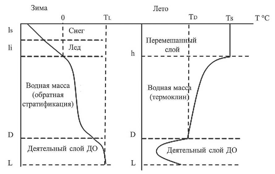 На рис. 2 схематично представлено вертикальное распределение температуры в системе снег — лед — водная масса — донные отложения, временнáя динамика которого рассчитывается в модели. Озеро в модели имеет трехслойную структуру. В период открытой воды (“Лето”) сверху находится верхний перемешанный слой (ВПС) толщиной h. ВПС из-за постоянно присутствующего ветрового / конвективного перемешивания имеет одинаковую по глубине температуру Ts. Ниже ВПС располагается зона термоклина толщиной D-h. В термоклине температура воды уменьшается до значения TD — температуры воды на границе раздела вода — дно. При этом водная масса озера имеет устойчивую плотностную стратификацию, что препятствует проникновению перемешивания, а вместе с ним и тепла в придонную область.
