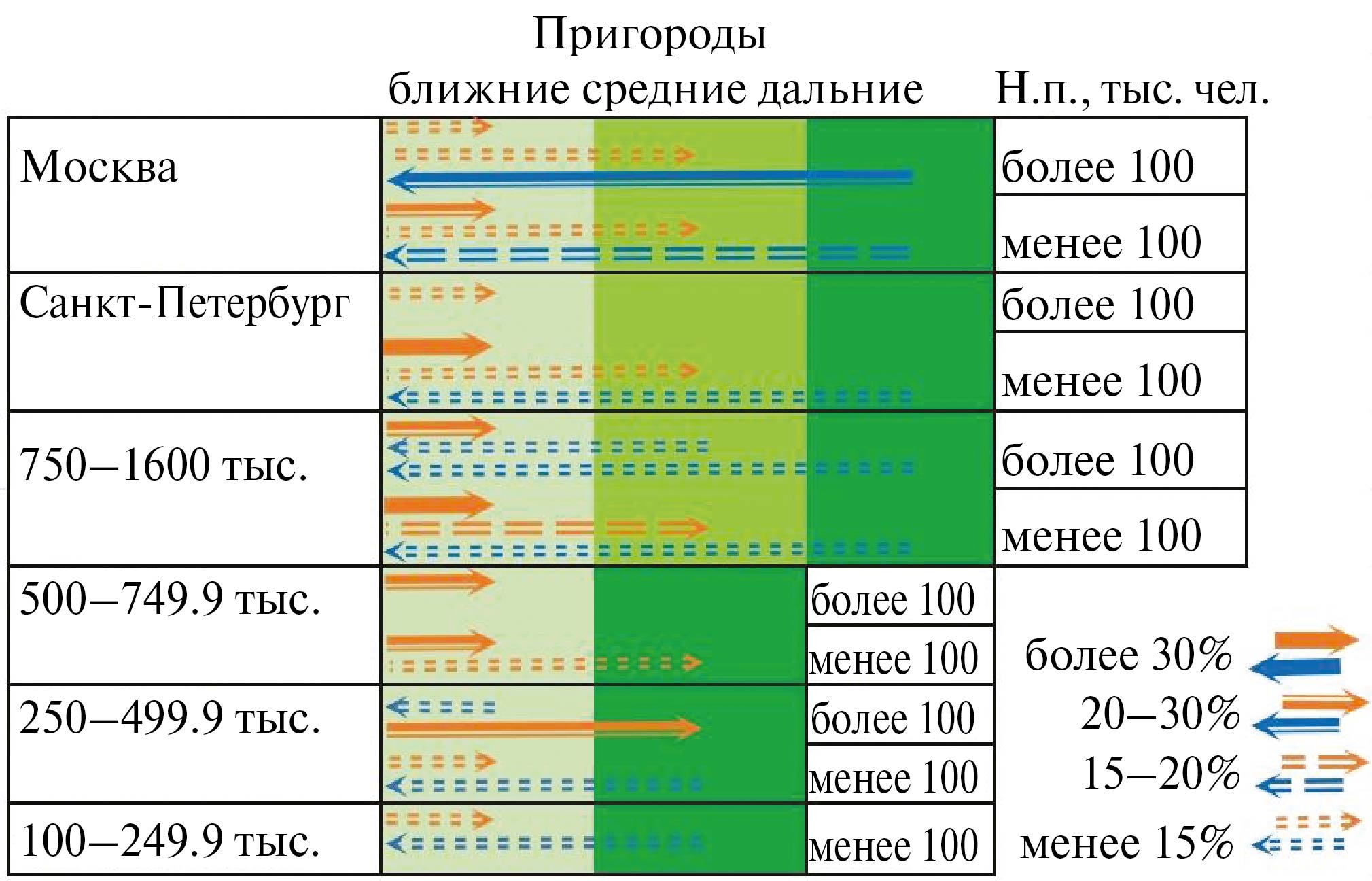 Ежегодно центры (крупные города) теряют население в миграционном обмене с пригородами в среднем порядка 50 тыс. чел. Почти все эти потери приходятся на ближние пригороды. Дальние пригороды, в свою очередь, теряют население в миграционном обмене с центрами.