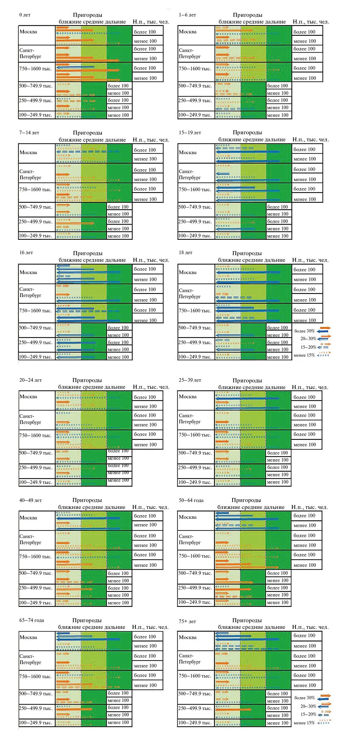 В более старших возрастах (40–49 лет), в предпенсионном и “младшем” пенсионном возрастах (50–64 года) поток из центров распространяется на средние и дальние пригороды, и он становится более однонаправленным. Это – отражение больших возможностей и желаний людей в данных возрастах жить ближе к природе, не связывая себя ежедневными поездками в город на работу. Вплоть до самого преклонного возраста, 75 лет и старше, потоков в сторону центров из пригородов практически нет, за исключением Москвы.
