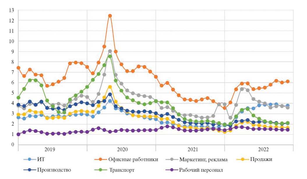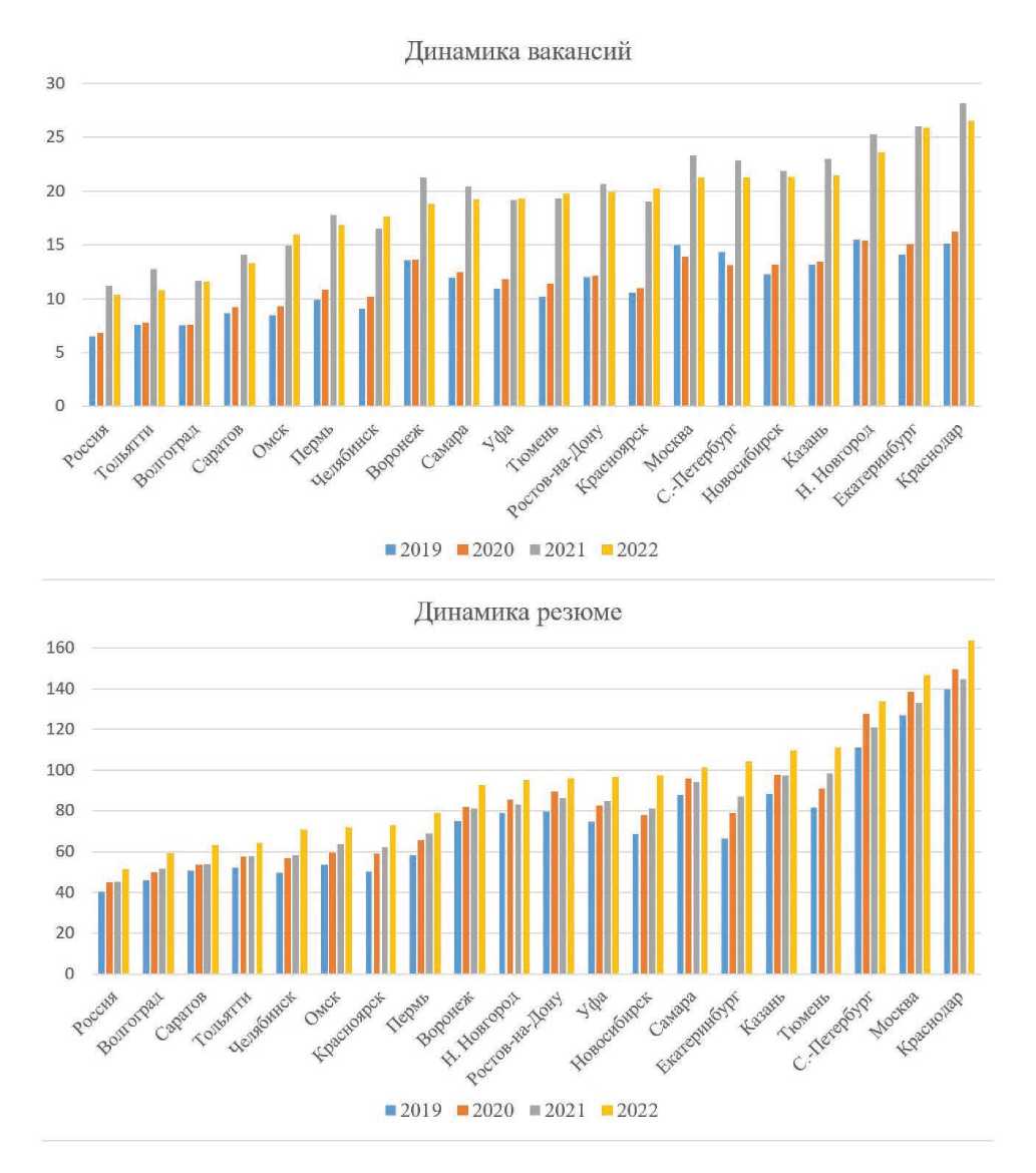 На динамике резюме произошедшие в начале 2020-х годов кризисы практически никак не отразились, здесь скорее проявляется влияние сезонных факторов. По резюме из особенностей отмечается значительное увеличение их количества в сфере IT в 2022 г., что связано с предоставлением льгот работникам этой области, появлением огромного количества различных экспресс курсов по программированию и очень высокими зарплатными ожиданиями, зачастую неоправданными, а также наличием брони от мобилизации в вооруженные силы. По итогу четырех лет количество резюме значительно увеличилось в сфере маркетинга и рекламы, а также среди рабочего персонала (на 44 и 30٪ соответственно). При этом среди высококвалифицированных работников промышленности, работников сферы транспорта и логистики и офисных работников наблюдается стагнация. Несколько более гибко вели себя резюме в сфере продаж: более заметное увеличение в 2020 и 2022 гг. на 11 и 16٪ соответственно.
