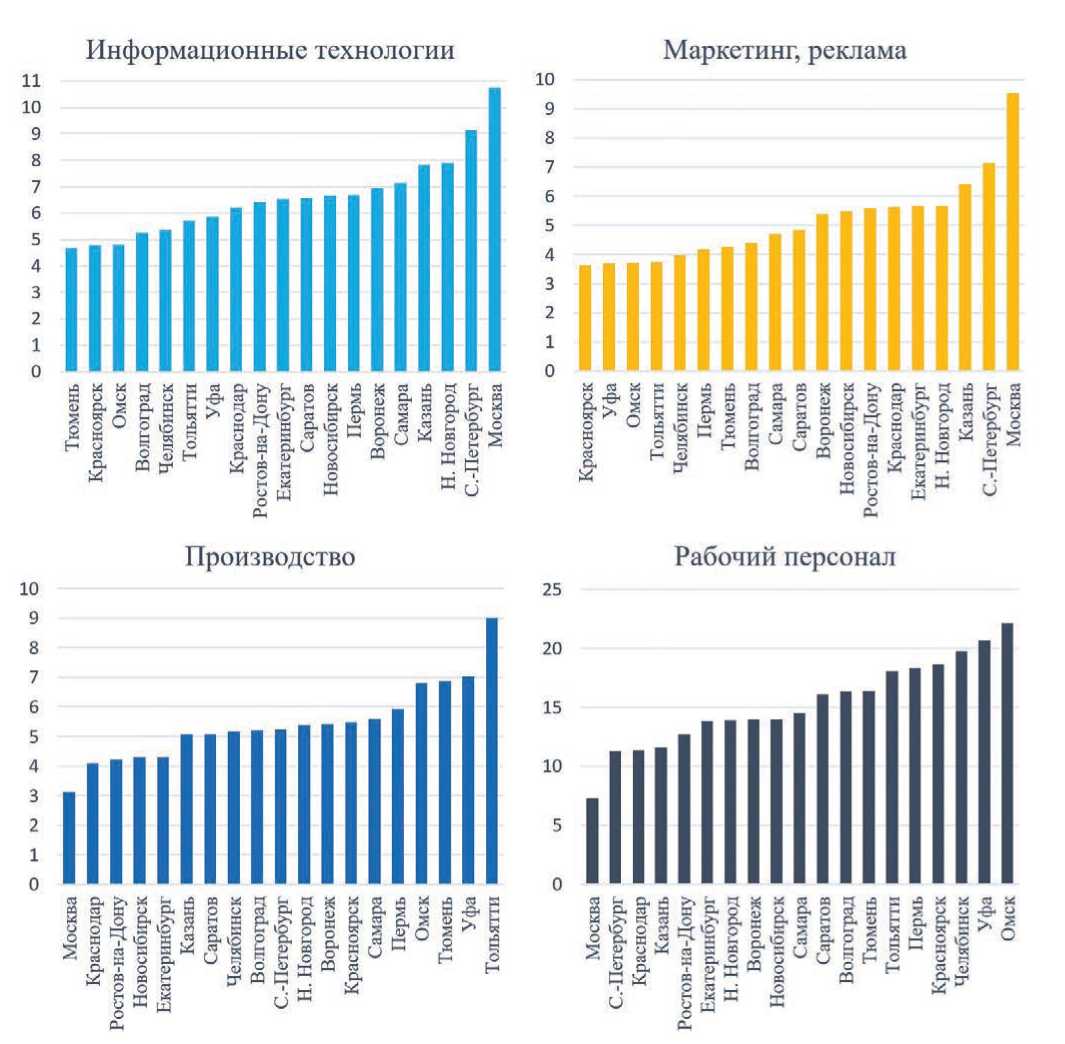 - высокоразвитые сервисно-цифровые: Москва, Санкт-Петербург и Казань (много IT, маркетинг и реклама);