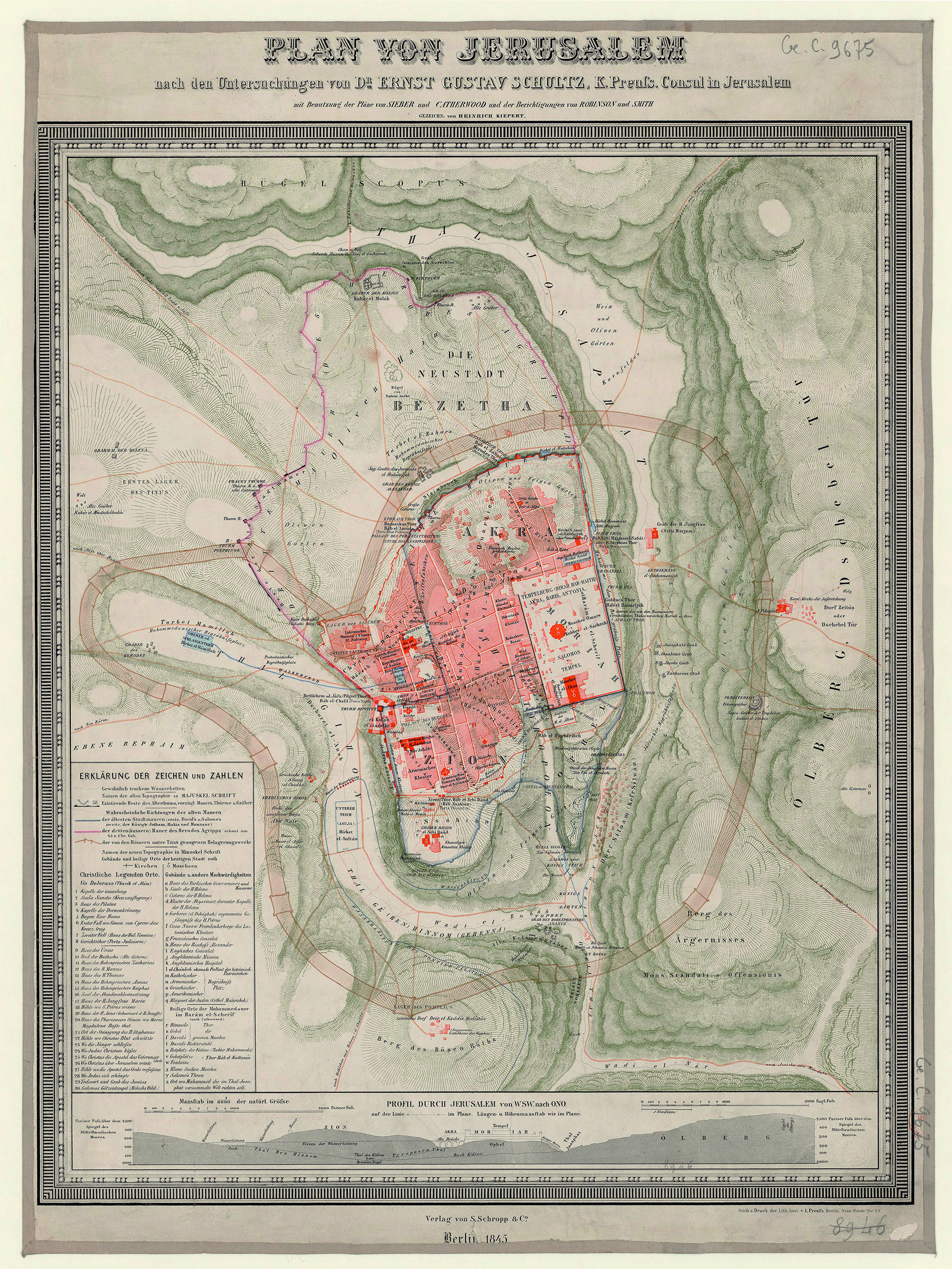 В Англии Э. Шульц с научными целями ездил в Кембридж и Оксфорд. Вернувшись на родину в начале 1845 г., он взял небольшой отпуск, поселился в доме своего отца и занялся работой над книгой. Поскольку он имел возможность и время тщательно изучить город, собранные им факты и наблюдения представляли собой в некоторых частях совершенно новый взгляд на топографию современного Иерусалима. До начала июля 1845 г. книга, имевшая подзаголовок «Лекция доктора Шульца, прусского королевского консула в Иерусалиме», была написана и сдана в печать в Берлине [22]. Э. Шульц вернулся в Палестину уже в звании консула летом 1845 г., так и не дождавшись выхода из печати своего труда. Предоставленный им топографический материал позволил ставшему уже известным картографом Г. Киперту построить новый план Иерусалима (ил. 5), который долгое время оставался лучшей и наиболее подробной картой Святого Града. Эта карта сохраняет своё историческое значение и в настоящее время [10, p. 5–55].