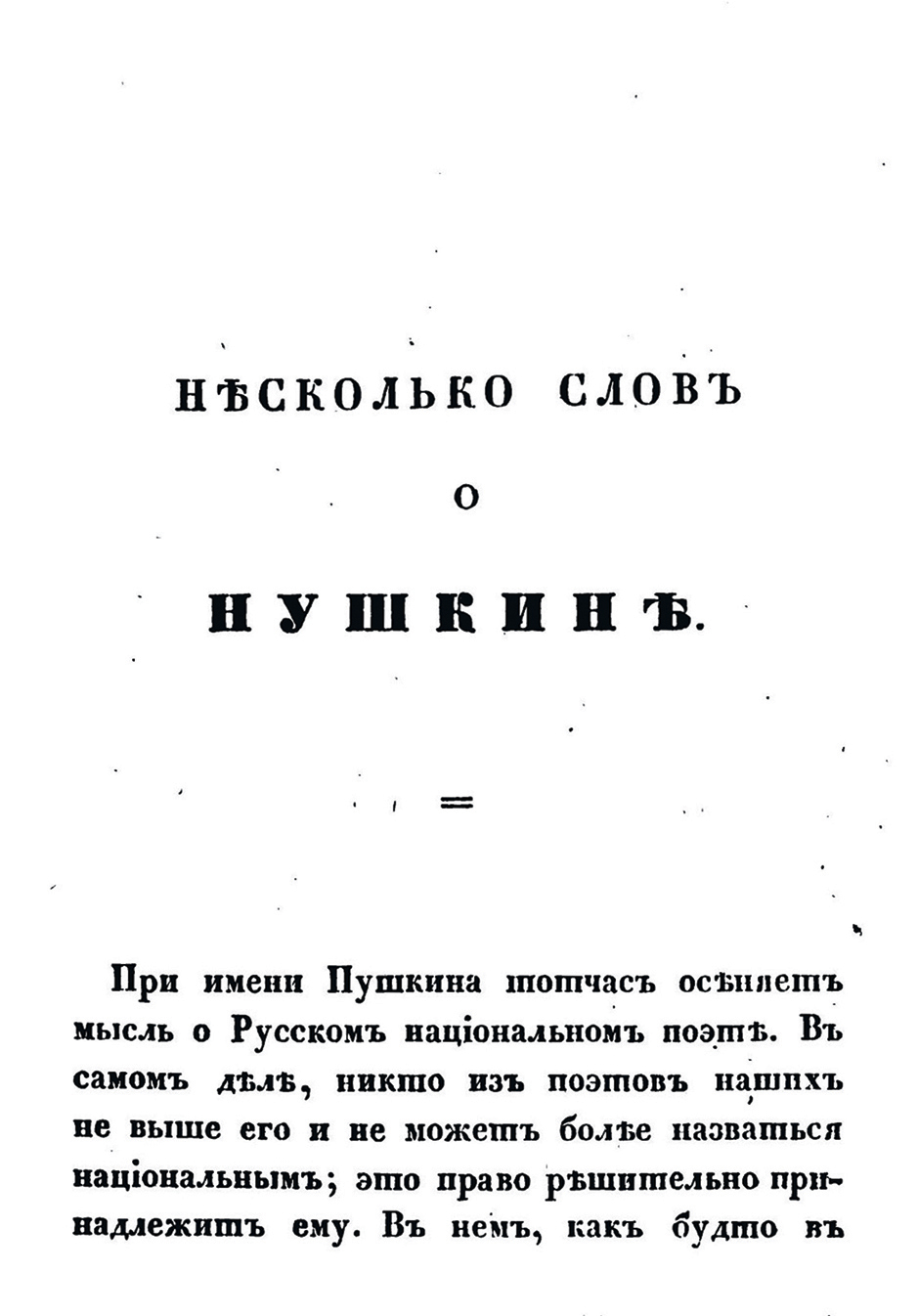 Даже В.Г. Белинский, авторитет которого зиждется исключительно на толкованиях русской классики, в том числе Пушкина, в 1834 и 1835 гг. заявлял, будто поэт является автором «мёртвых, безжизненных сказок»; писал о нём в прошедшем времени и заявлял, что тот «кончился», «мало народен», «свершил круг своей художнической деятельности» и «оставил» первое место в ряду русских литераторов [3, т. 1, с. 21, 87, 91, 284, 306]1. Белинский тут же свидетельствовал, что «ни один поэт на Руси», кроме Пушкина, «не пользовался такою народностию, такою славою при жизни, и ни один не был так жестоко оскорбляем» [3, т. 1, с. 71].
