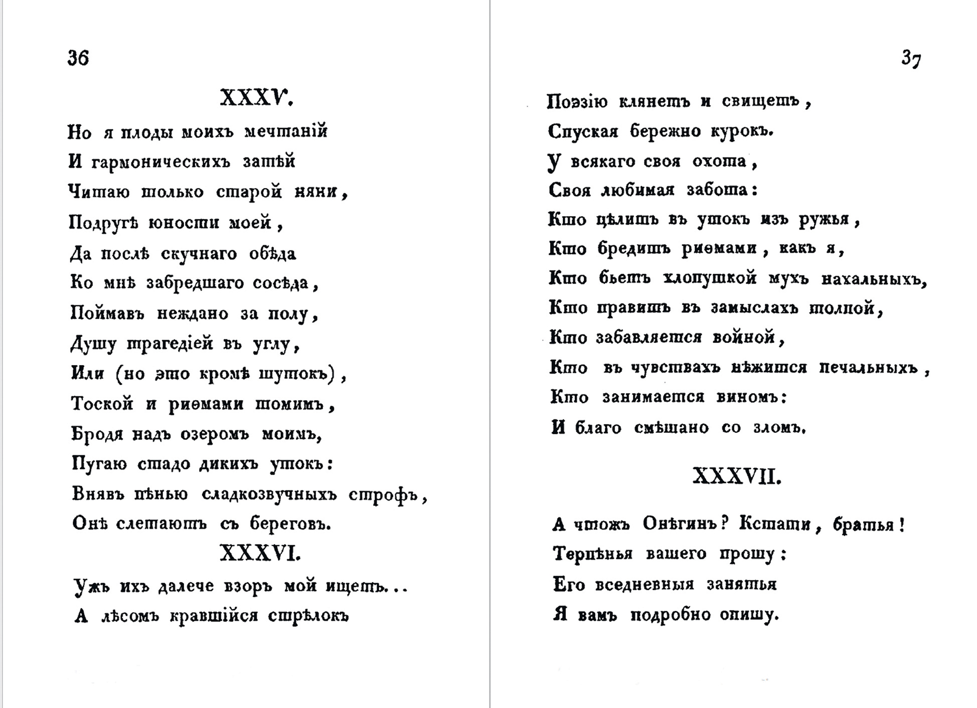 Ил. 8. А.С. Пушкин «Евгений Онегин». Глава IV и <глава> V. СПб., 1828 г. Страницы, содержащие XXXVI строфу четвёртой главы (строфа исключена в последующих изданиях)