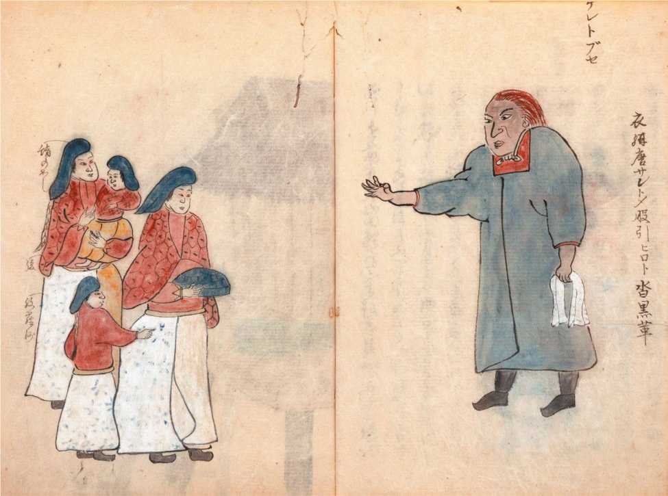 Ил. 5. Предводитель российского поселения на Урупе Василий Звездочётов и русские женщины с детьми. Японский рисунок 1804 г. Источник: https://www.jonathanahill.com/pages/books/8401/masayasu-habuto-not-masakai/ manuscript-on-paper-entitled-kyumei-koki-governmental-history-of-hokkaido