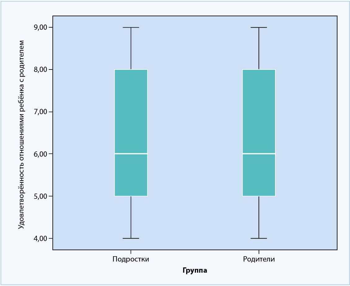 Обнаружено, что нет различий между группами по параметру «Удовлетворённость отношениями ребёнка с родителем» (F=2,322; p =0,943) (рис. 2). Этот факт является неблагоприятным, поскольку респонденты, отвечая на вопросы, иллюстрирующие данный диагностический параметр, сходны в мнении о том, что нет удовлетворённости в отношениях между родителями и детьми. Низкий уровень удовлетворённости свидетельствует о том, что подростки и их родители обеспокоены текущей семейной ситуацией. В отношениях ухудшается коммуникация, что является важной проблемой, которая негативно влияет на развитие детей и качество семейных связей. Основная причина кроется в переходе от традиционных форм общения к цифровым. Время, проведённое у экранов, часто заменяет живое взаимодействие. Отсутствие совместных активностей: игр, прогулок, семейных ужинов и др., снижает качество общения. Стресс и эмоциональное состояние также сказываются на ДРО. В современном обществе акцент на успех и достижения приводит к тому, что родители меньше времени уделяют эмоциональной поддержке и общению с детьми.