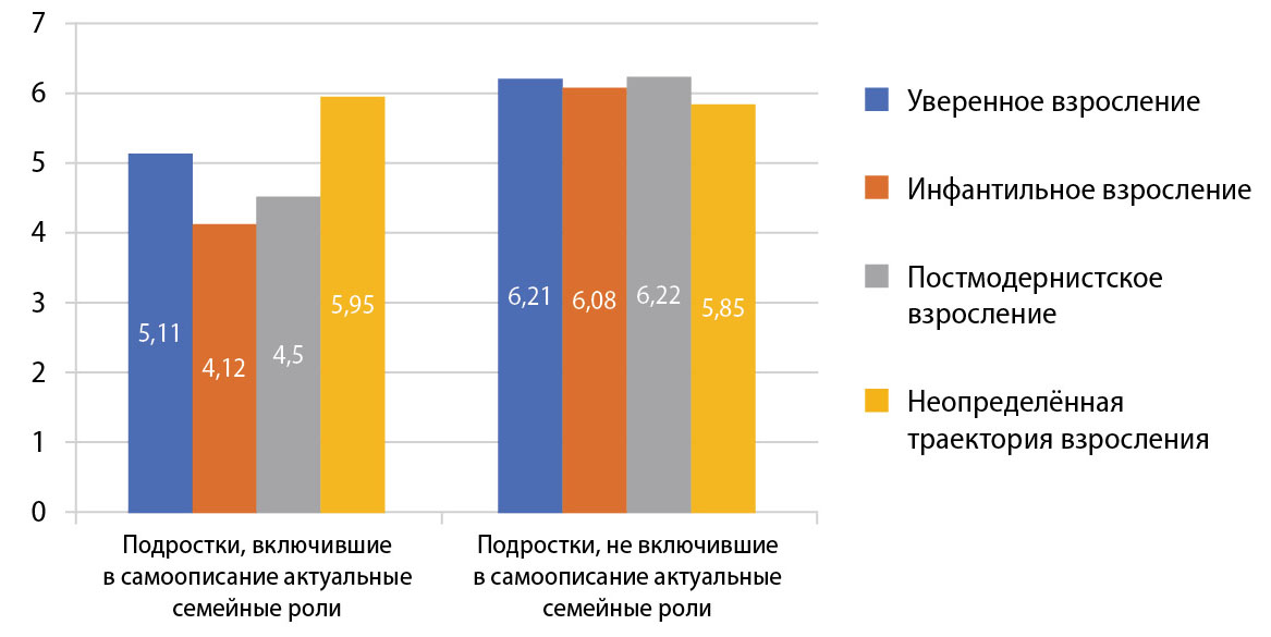 Согласно полученным результатам, актуальные семейные роли встречаются в самоописаниях 39,3% опрошенных подростков. При этом в подгруппе, демонстрирующей инфантильное взросление, частота упоминания этих ролей в среднем в полтора раза выше, чем в остальных (уверенное взросление — 34,3%, постмодернистское взросление — 43,7%, неопределённая траектория взросления — 39,2%), и составляет 52,3%. Будущие семейные роли (супружеские, родительские) подростки включали в самоописания значительно реже — в 4,3% случаев. Причём чаще других их упоминали подростки с уверенным взрослением (11,1%), реже — подростки с неопределённой траекторией взросления (1,4%), подростки с инфантильной и постмодернистской траекториями взросления занимают промежуточное положение (4,7% и 6,3% соответственно).